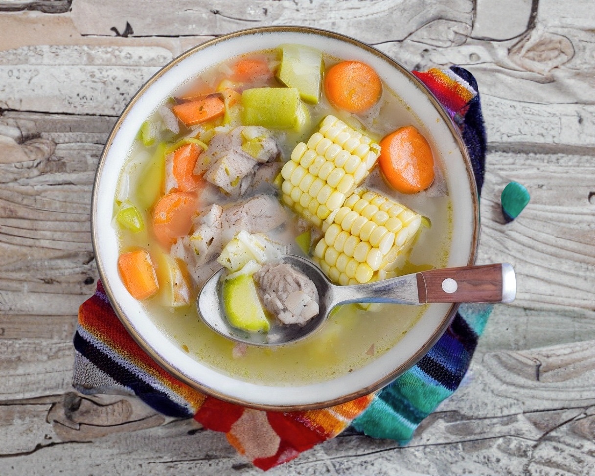 Caldo con porción de carne de res, elote, verduras, limón, arroz, salsa y 6 tortillas.