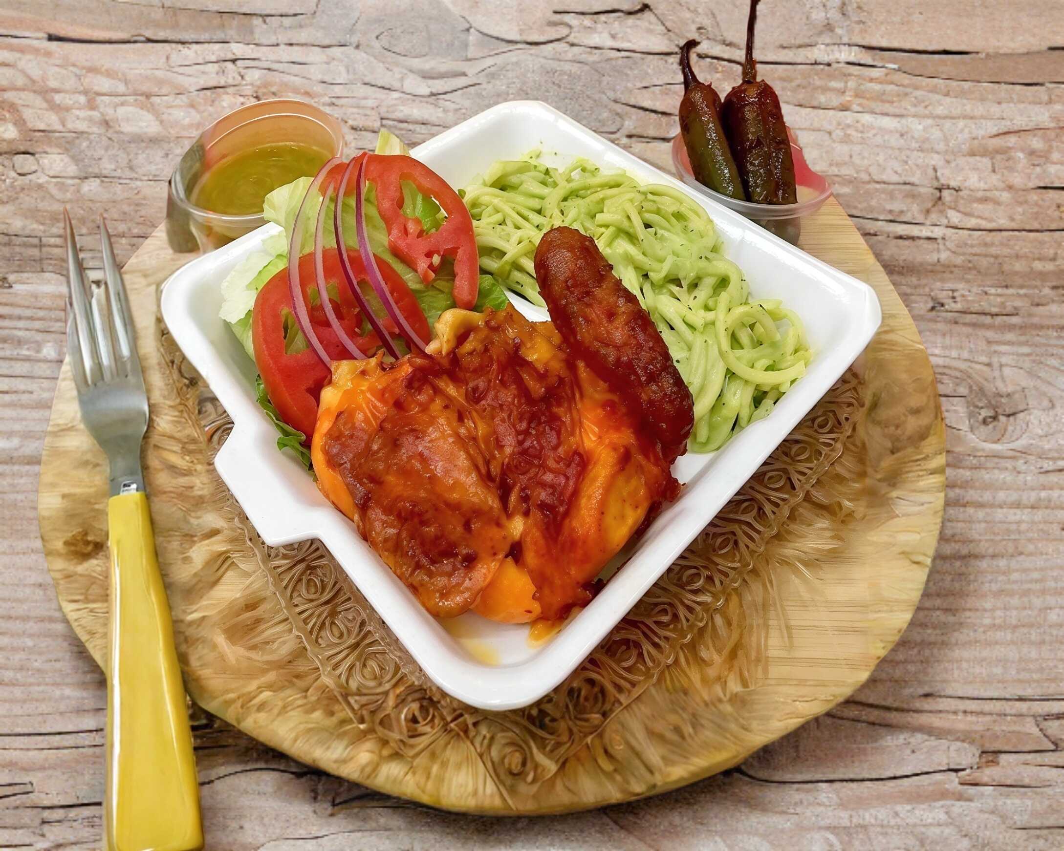1/4 de pollo rostizado (pierna o pechuga) con espaguetti verde, ensalada de lechuga, chiles toreados, tortillas y salsa.
