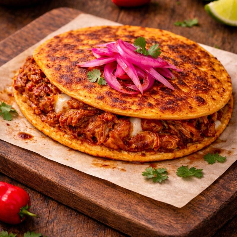 Tortilla de harina, cochinita pibil y queso.