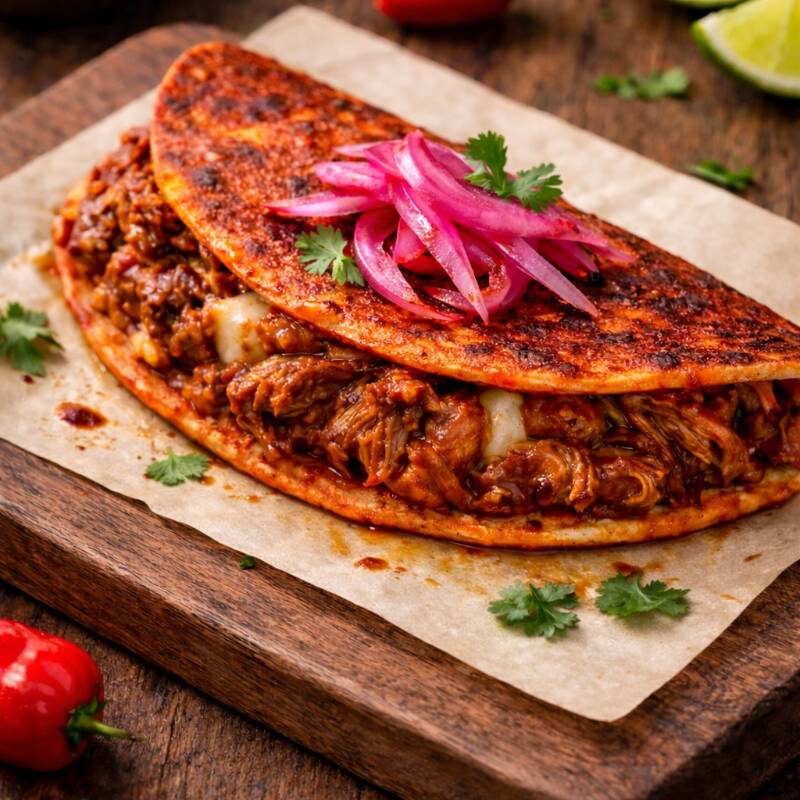 Tortilla de harina, cochinita pibil, mayonesa, aguacate y cebolla morada.