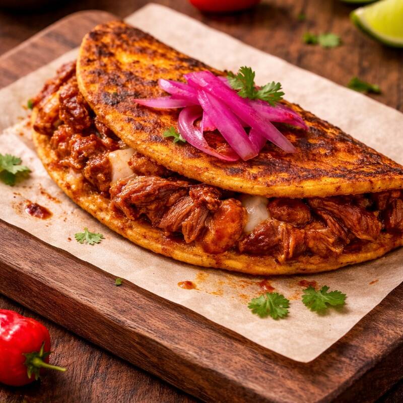 Dos tortillas de maíz, cochinita pibil y queso.