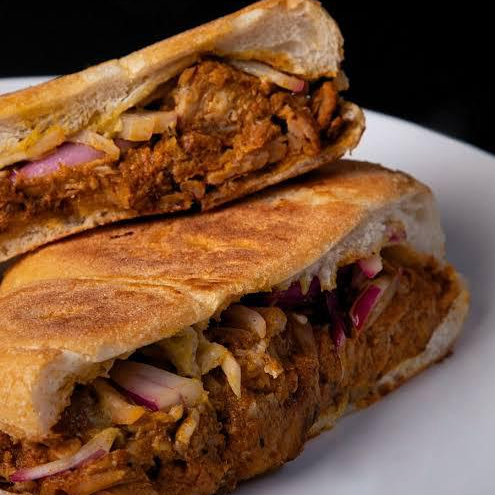 Pan telera, cochinita pibil, mayonesa, mostaza, tomate, chile jalapeño, aguacate y cebolla morada.