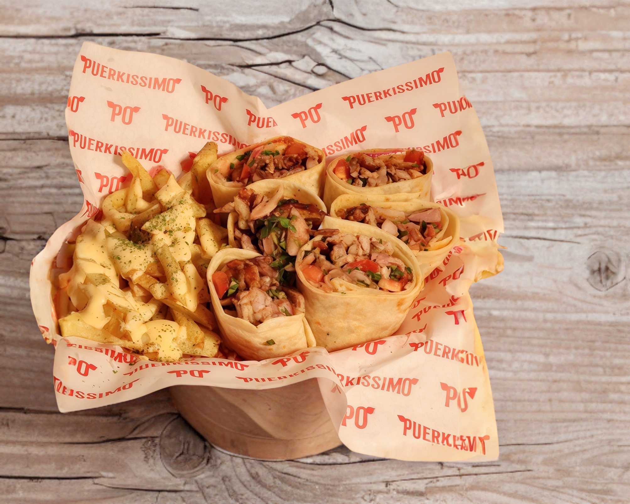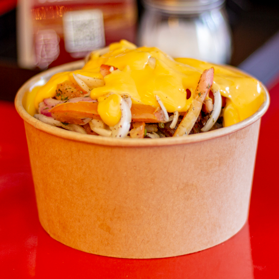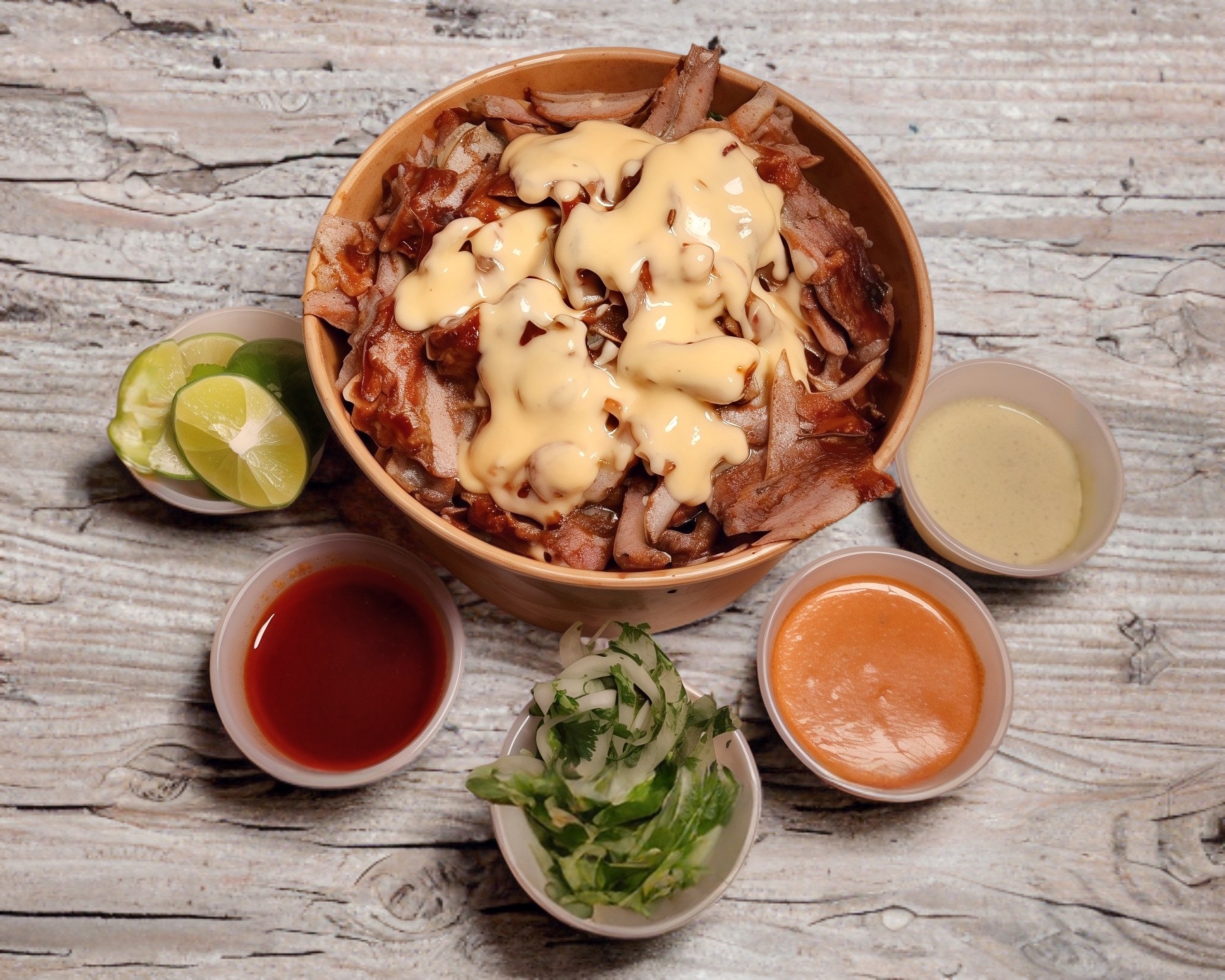 Bowl de 1/2kg cargado de puro sabor, base de papas fritas, queso mozarella al sarten, 130 gr de carne asada al trompo, salsa de ajo de la casa y queso cheddar.