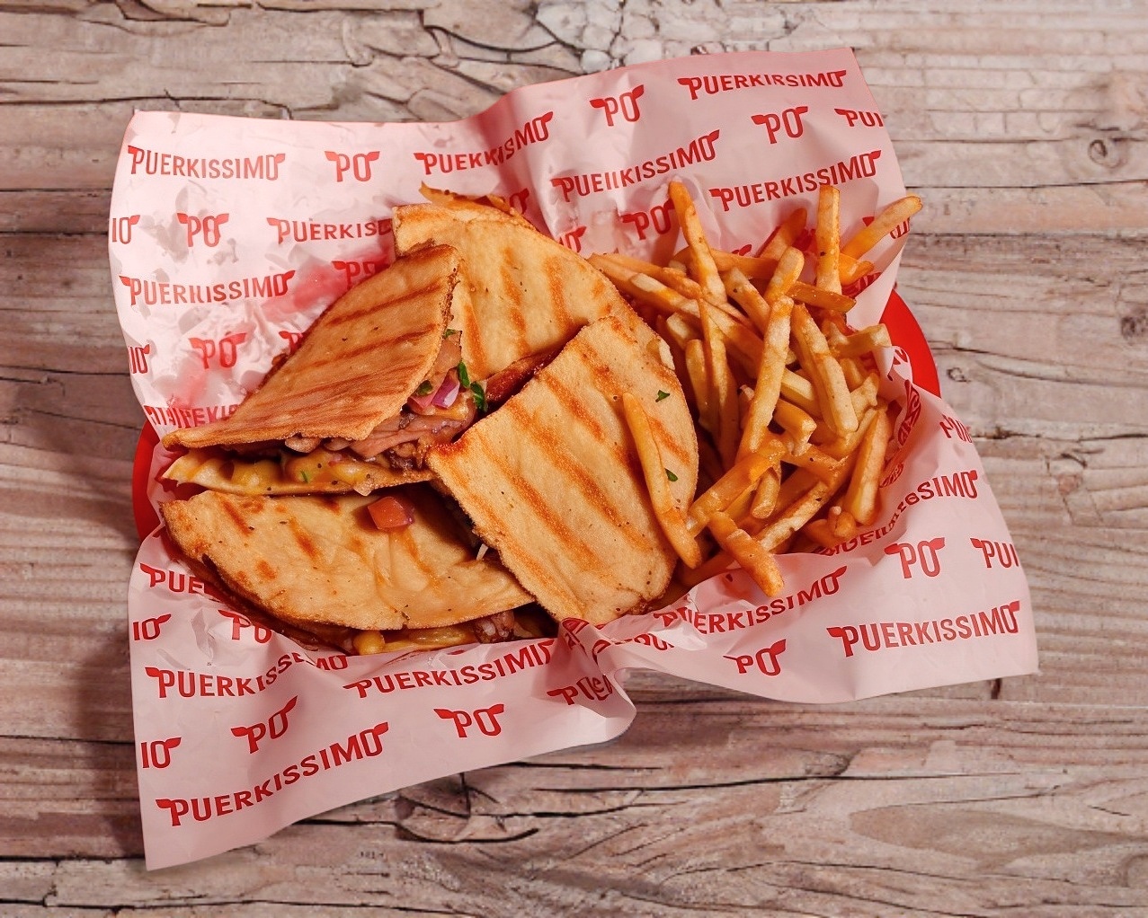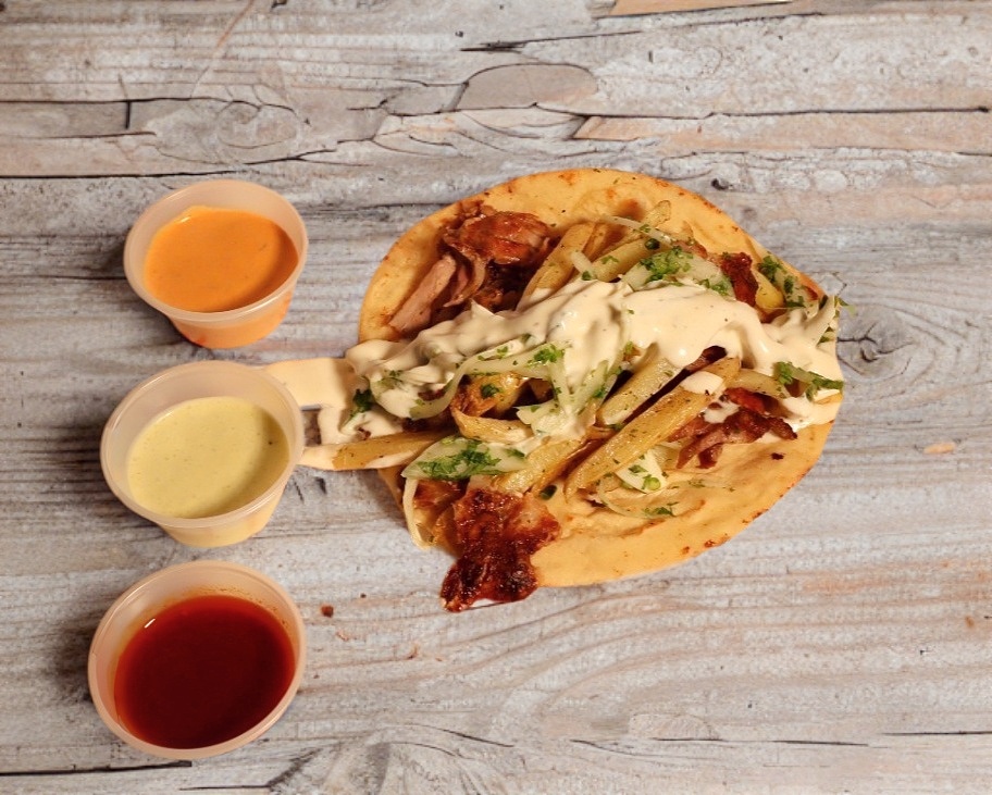 Doble pan pita, 150 gr de carne asada al trompo, salsa de ajo de la casa y queso mozarella. Acompañado de papas a la francesa.