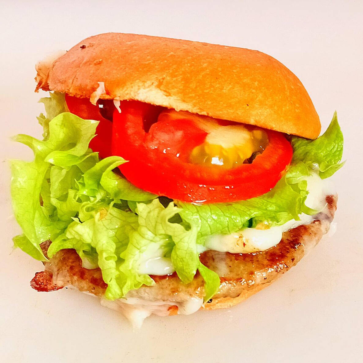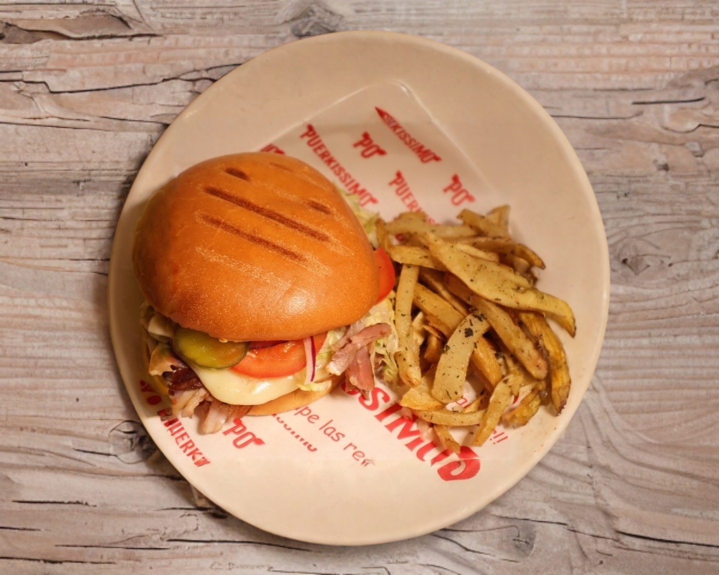 Pan Brioche, 130 gr de carne asada al trompo, lechuga, jitomates y pepinillos al gusto con queso mozarella al sarten y papas fritas.