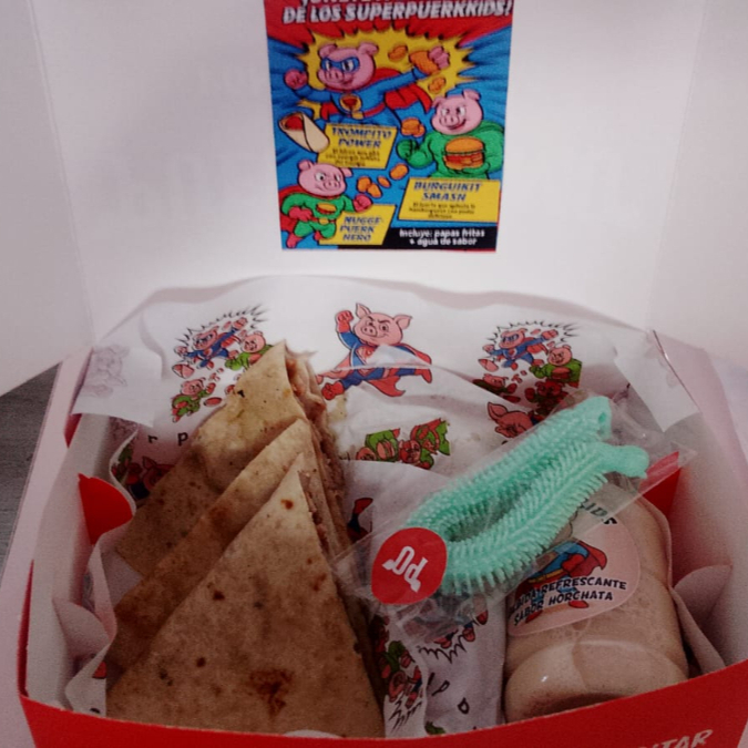 Tres quesadillas con carne al trompo y queso mozzarella derretido, inculye papas a la francesa y agua de sabor+juguete sorpresa.