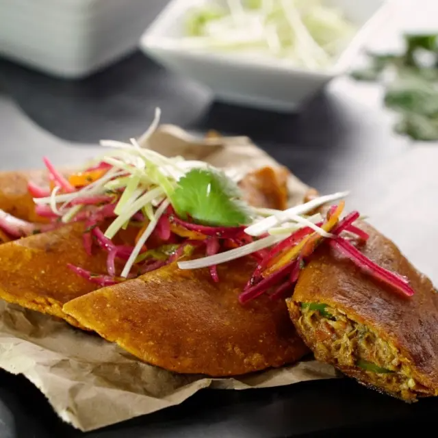 3 EMPANADAS RELLENAS DE QUESO MOZZARELLA CORONADAS CON REPOLLO, QUESO FRECO Y CREMA