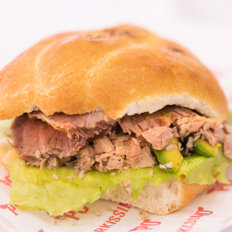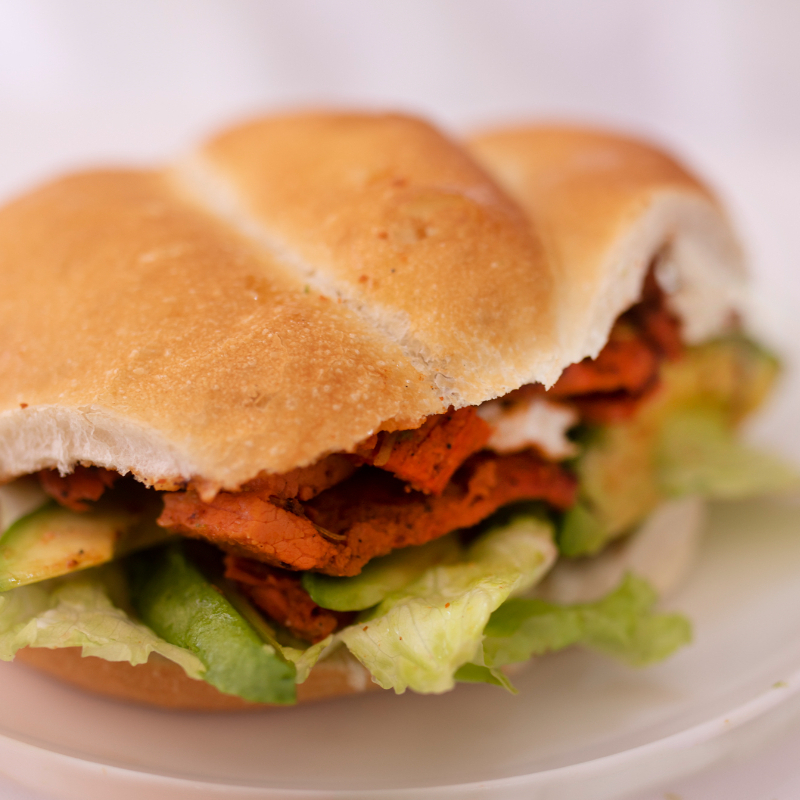 Bolillo crujiente, carne asada al trompo, ensalada de cebolla y queso Mozarella.