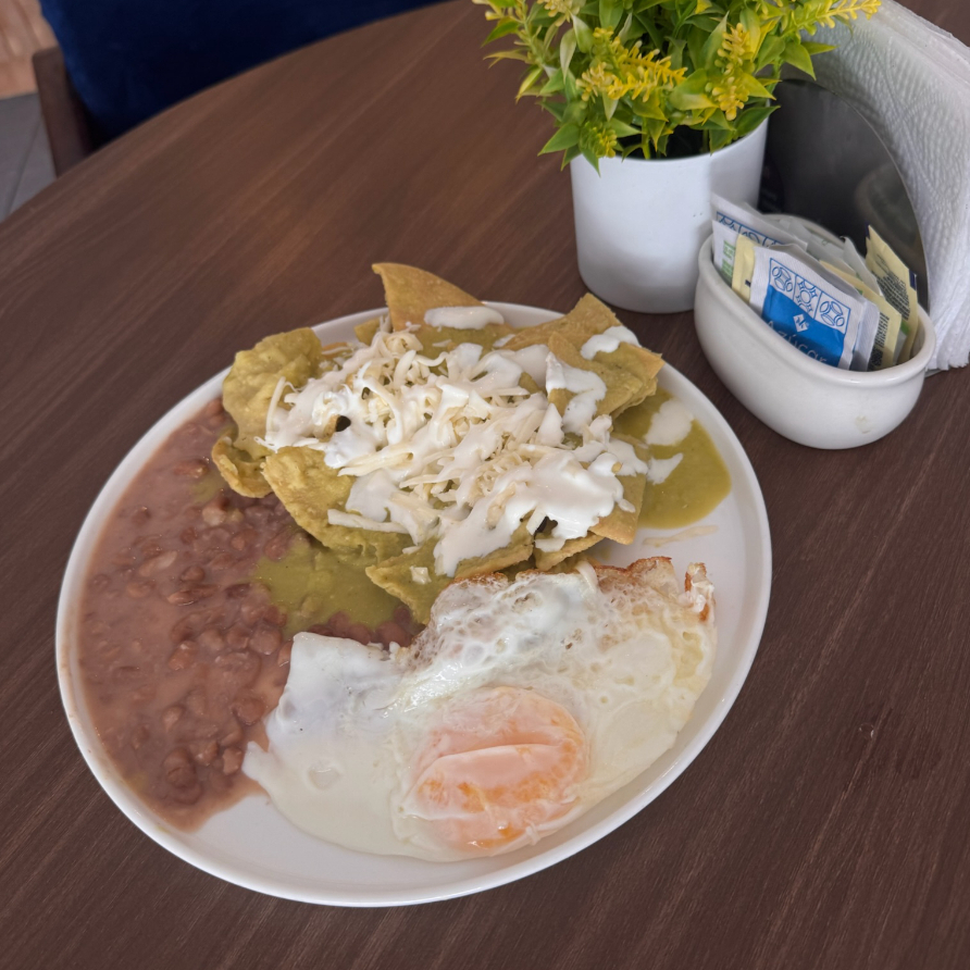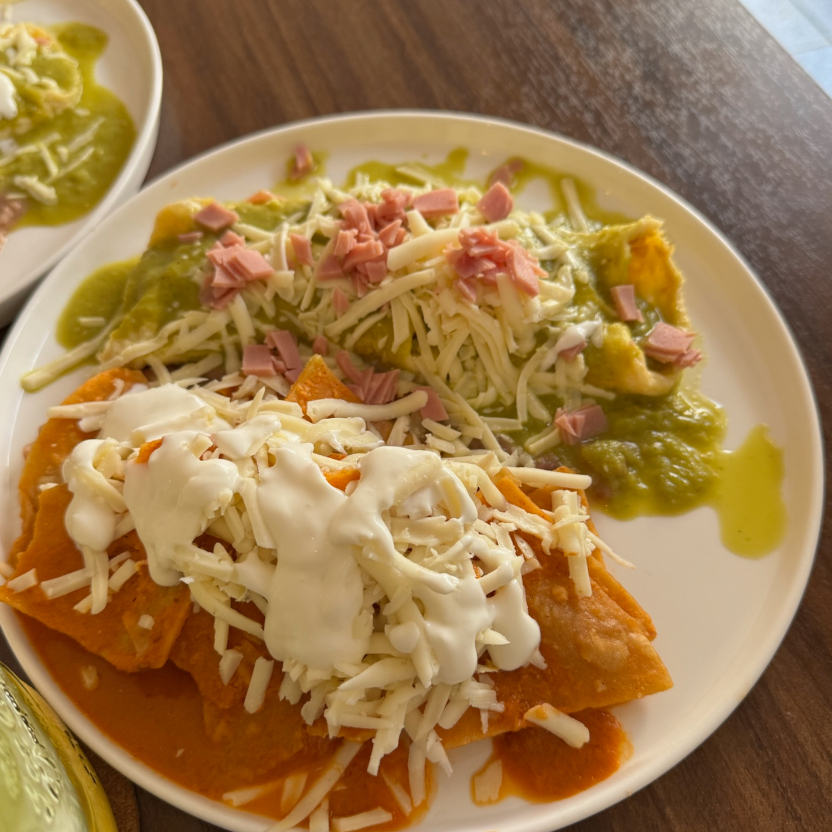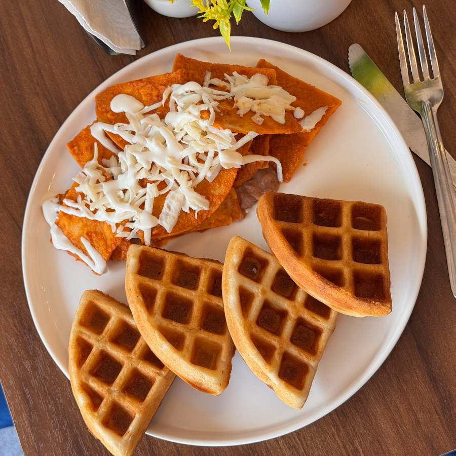Media orden de chilaquiles de salsa a escoger acompañados de un waffle, miel de mapple y lechera