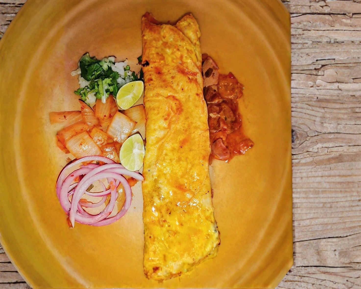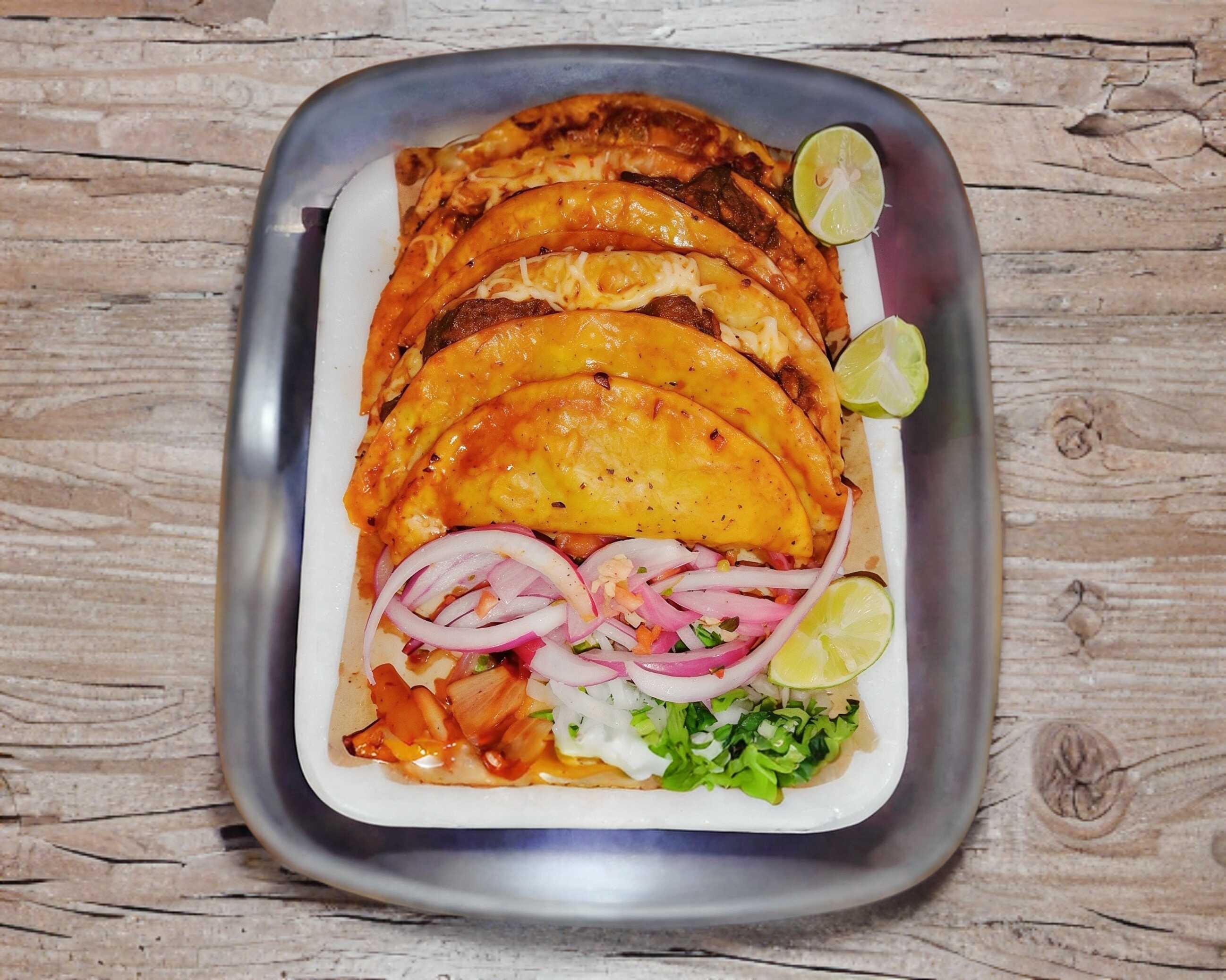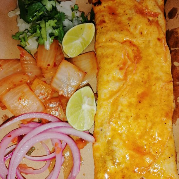Doble tortilla normal, carne y queso, acompañado con verduritas y cebollas