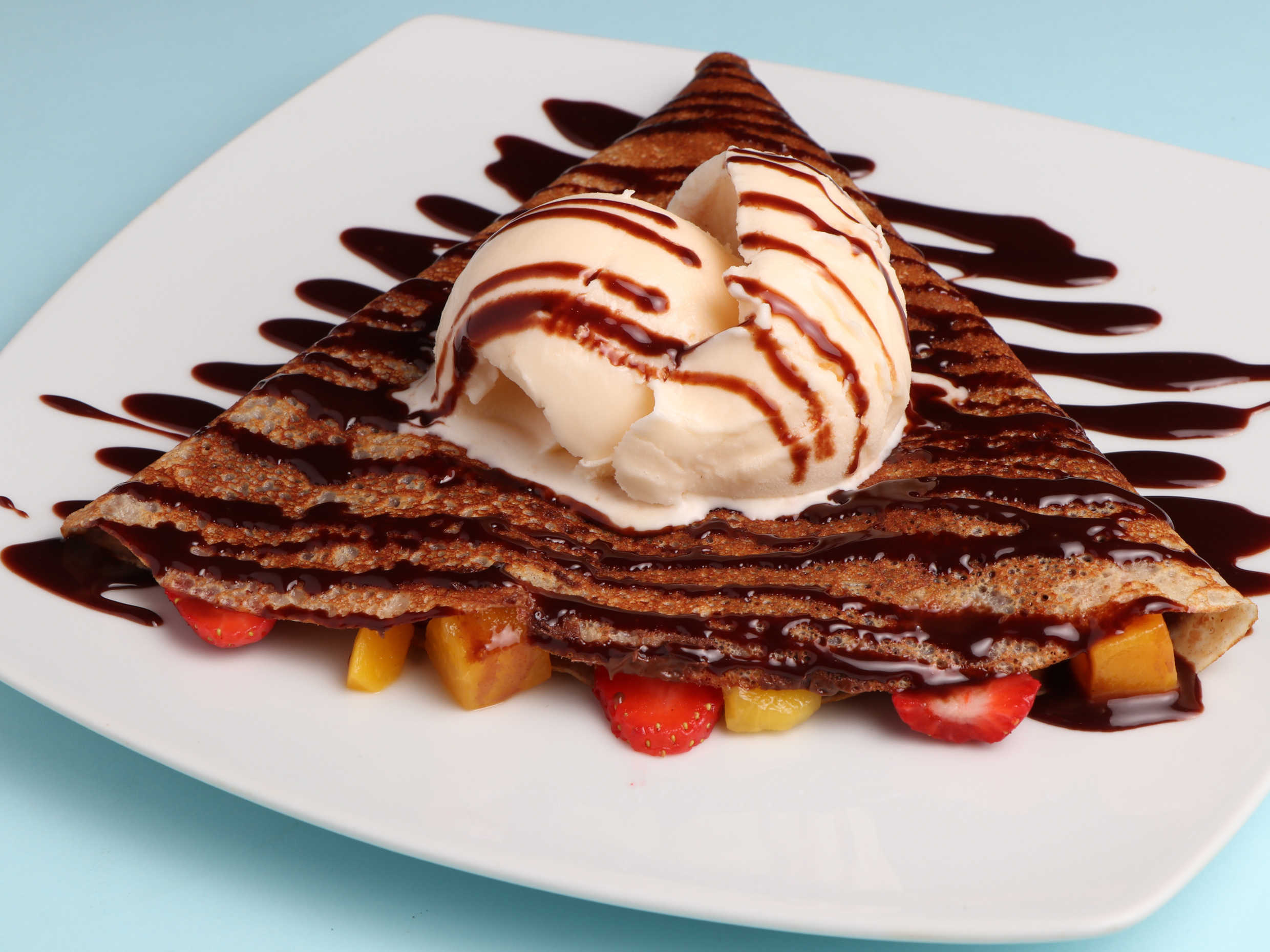 Crepa de jamón, Philadelphia, piña y cereza.