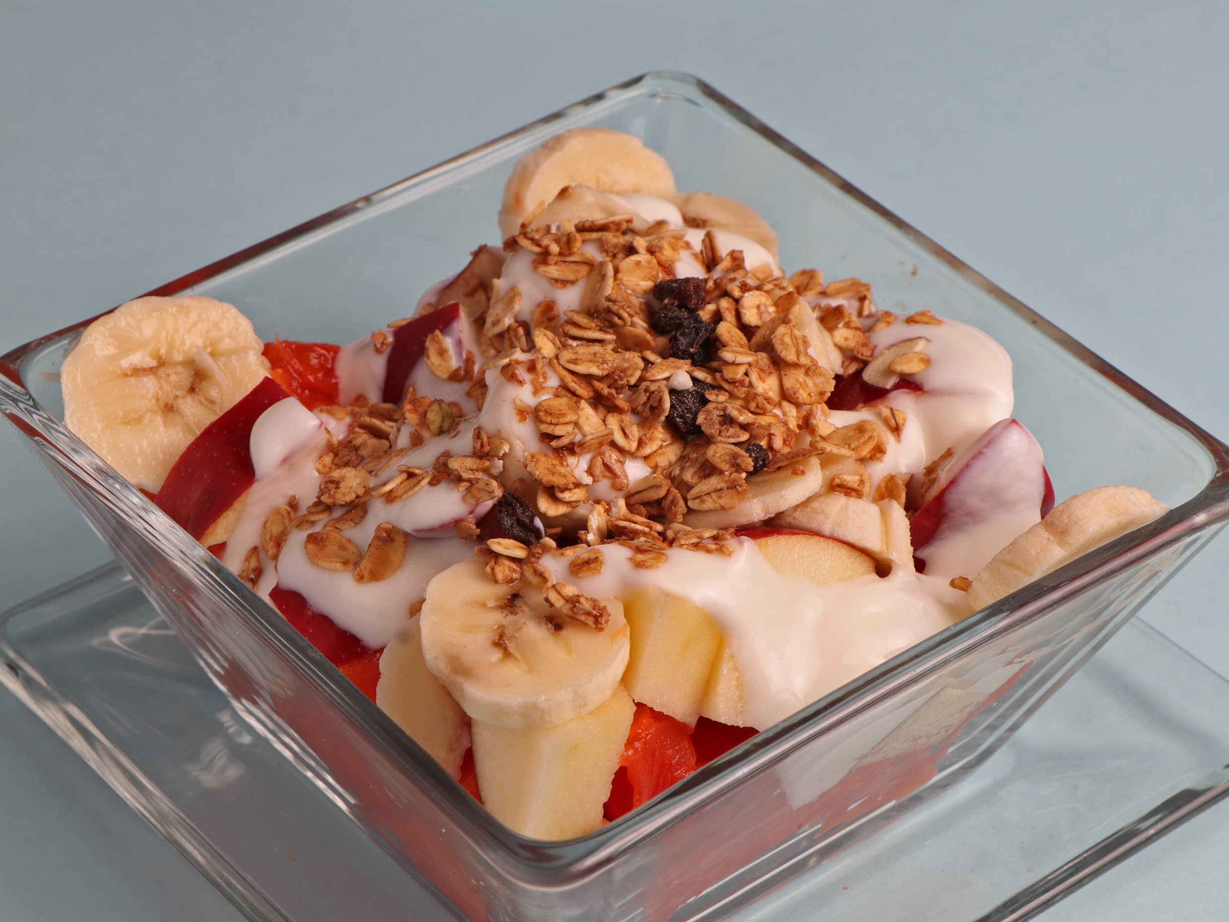 Papaya, manzana, plátano, yoghurt y granola.