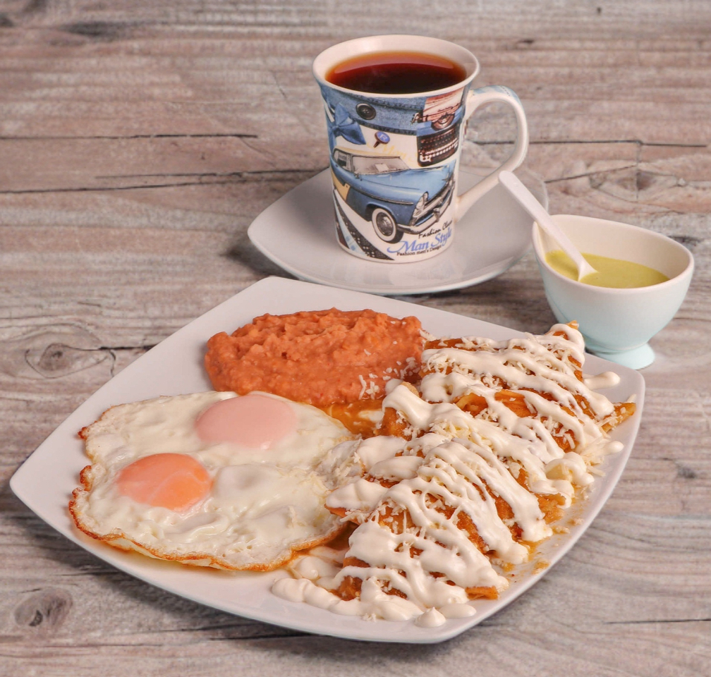 Chilaquiles, huevo, frijoles y café americano.