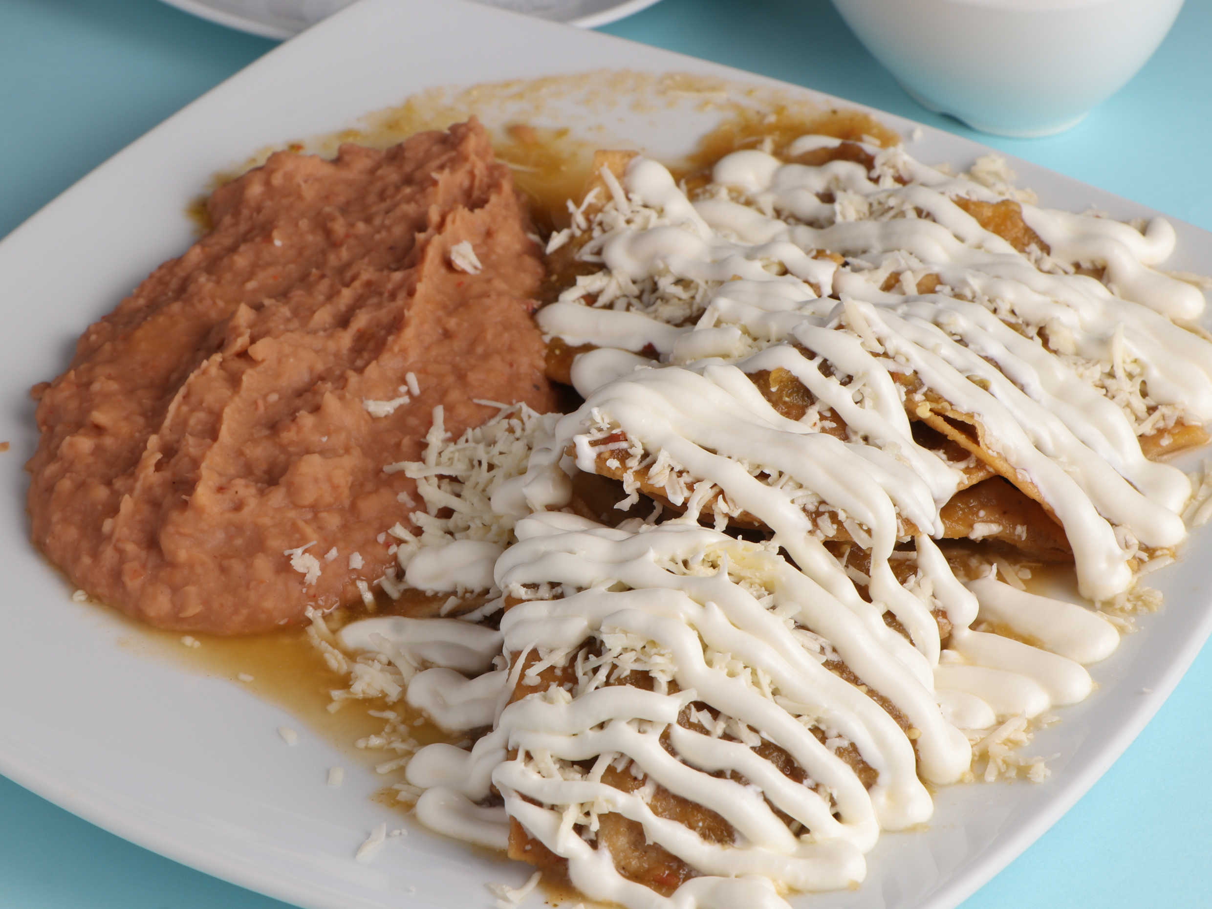 Chilaquiles acompañados de 2 huevos, ó frijoles ó papitas con crema + salsa roja, chipotle ó verde + crema y queso chihuahua.