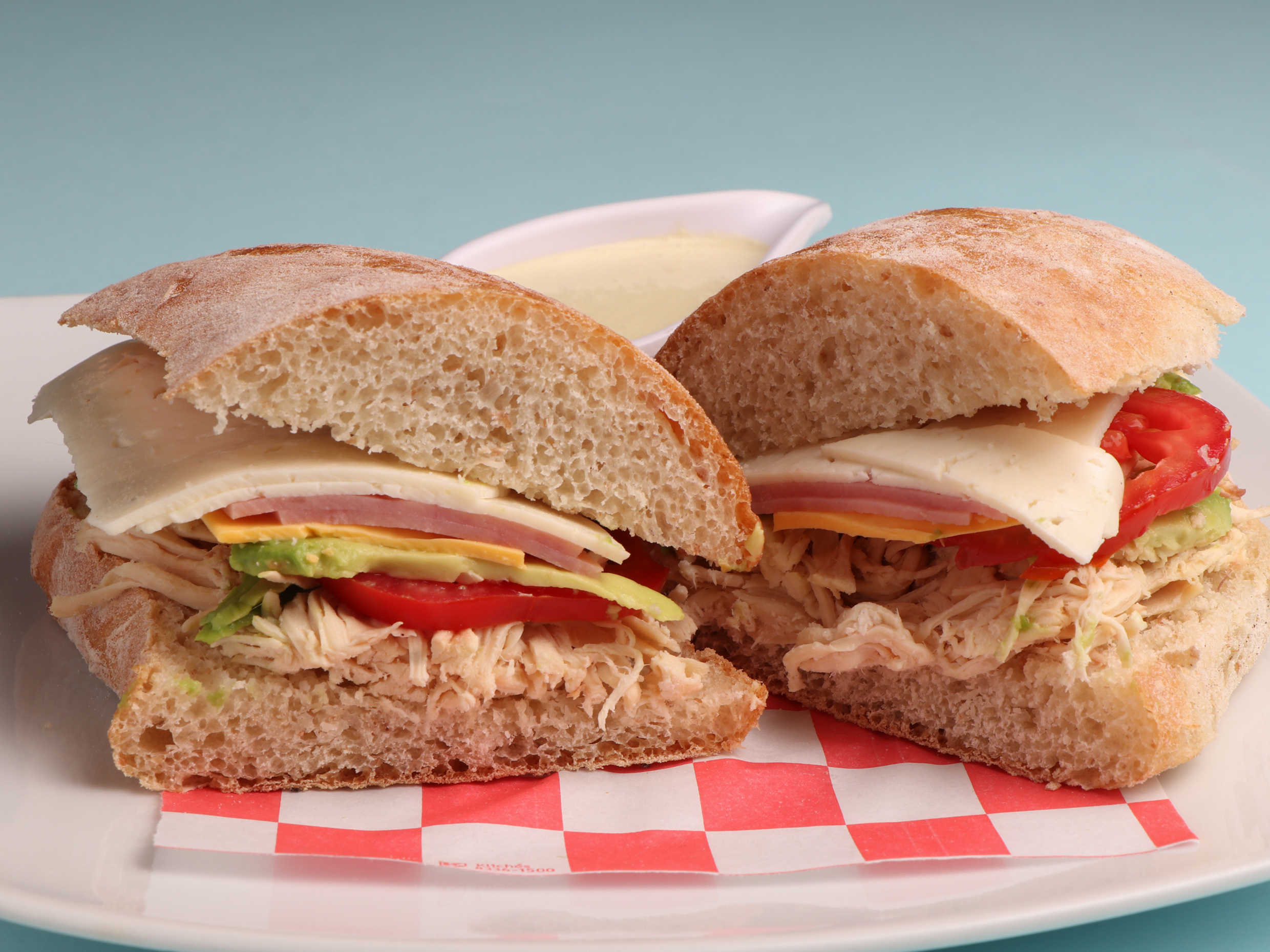 Pollo, jamón, quesos, aguacate y tomate.