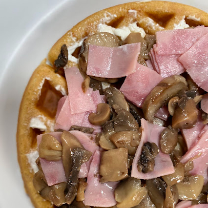 Waffle Philadelphia, champiñones y jamón.