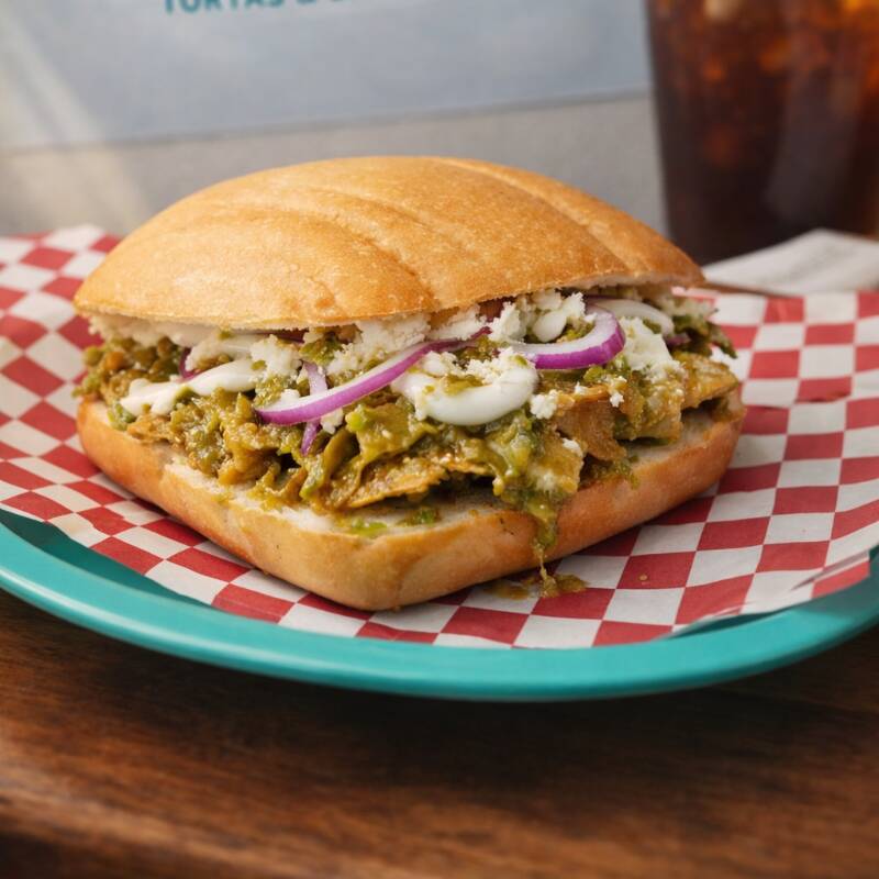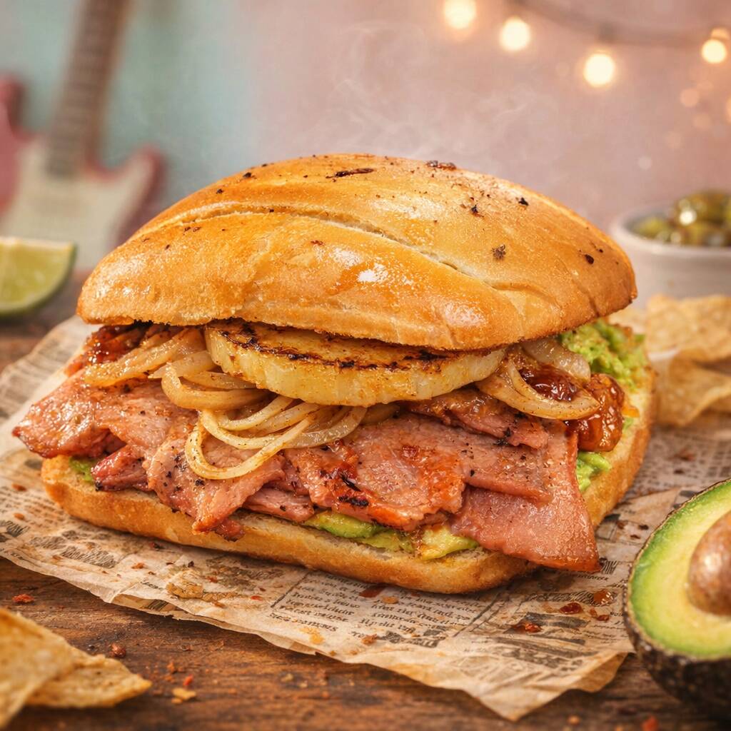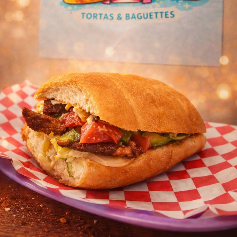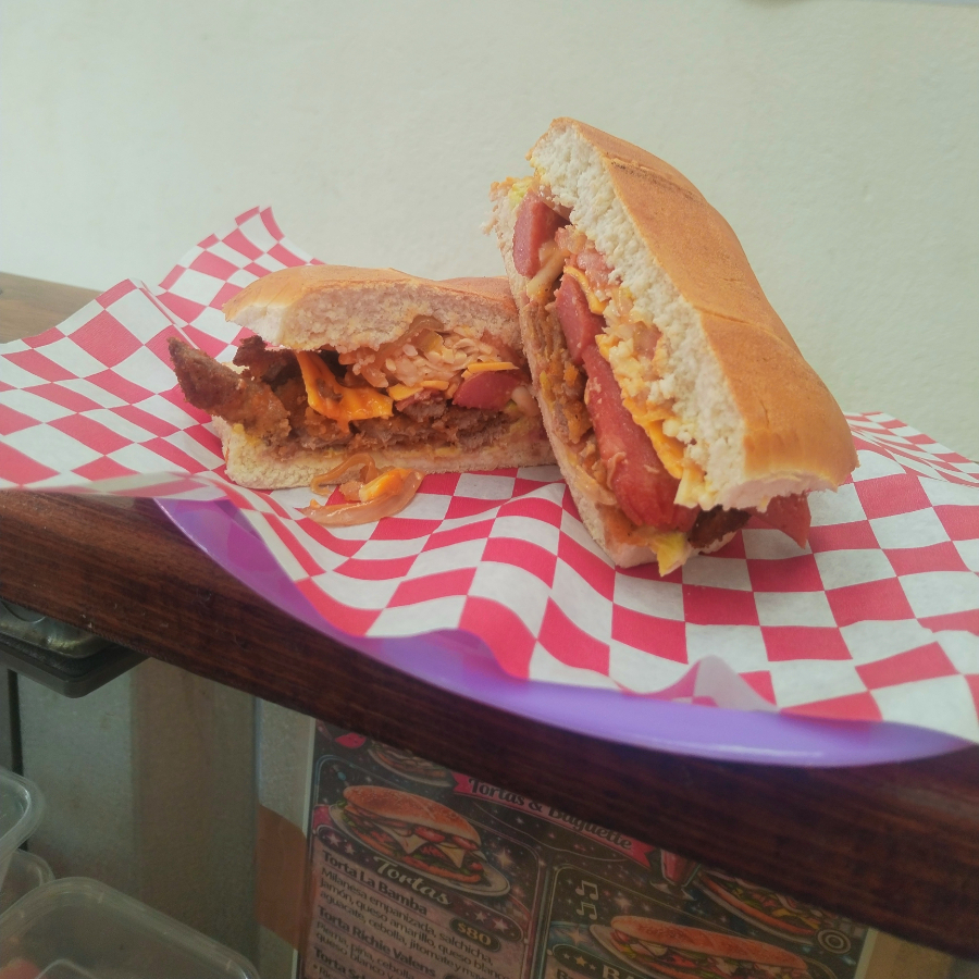 Milanesa empanizada, salchicha, jamón, queso amarillo, queso blanco, aguacate, cebolla, jitomate y mayonesa.