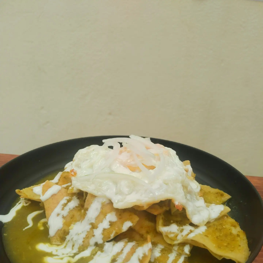 Chilaquiles en salsa verde picosa, crema, queso, cebolla y frijoles refritos