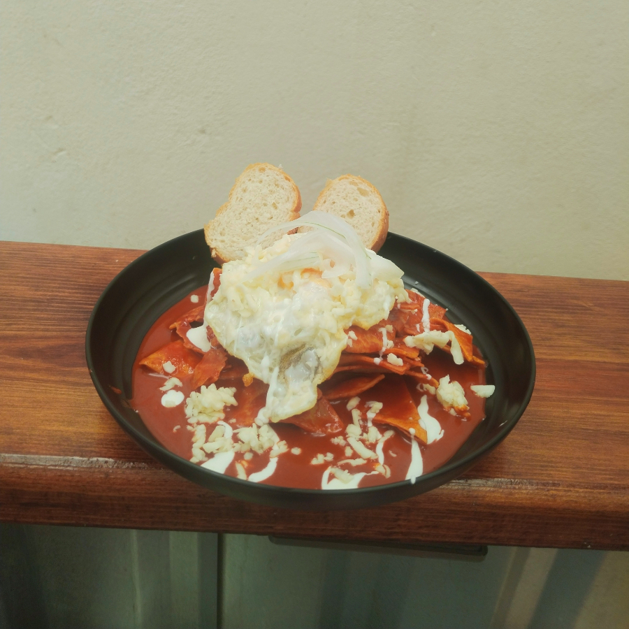 Chilaquiles con salsa roja dulce, queso, crema, cebolla y frijoles refritos