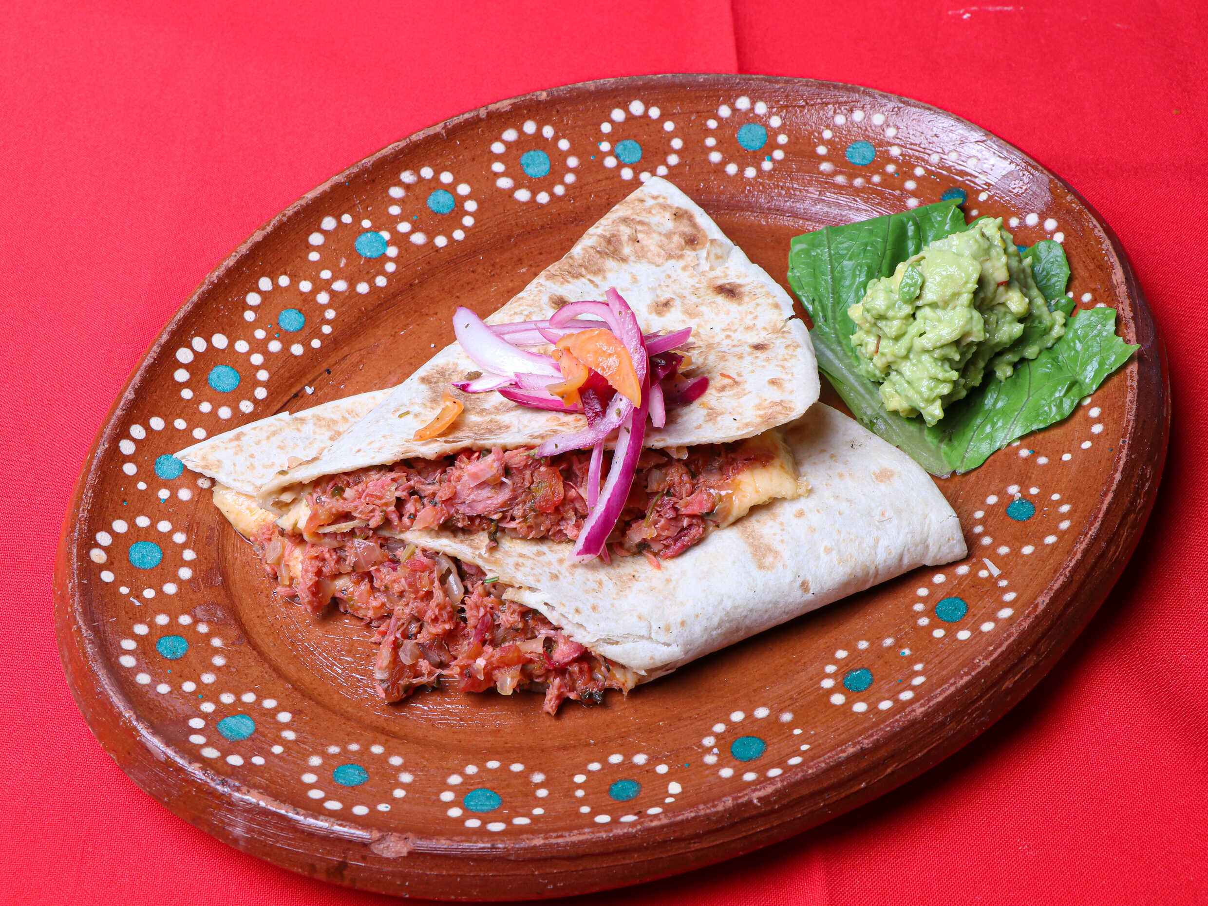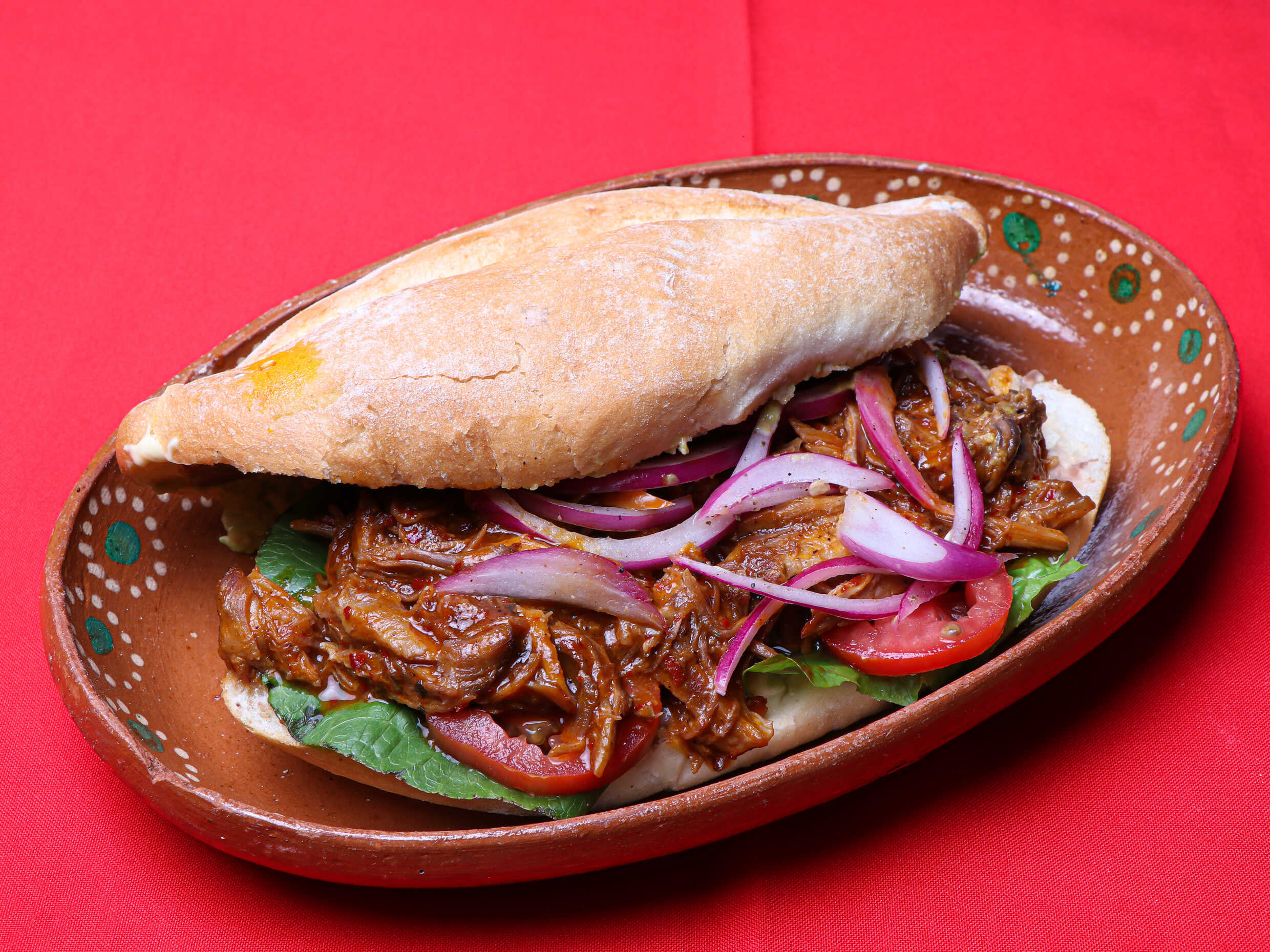 Rica torta de cochinita a la pibil, acompañada de chipotle, aguacate y cebolla con habanero en escabeche.