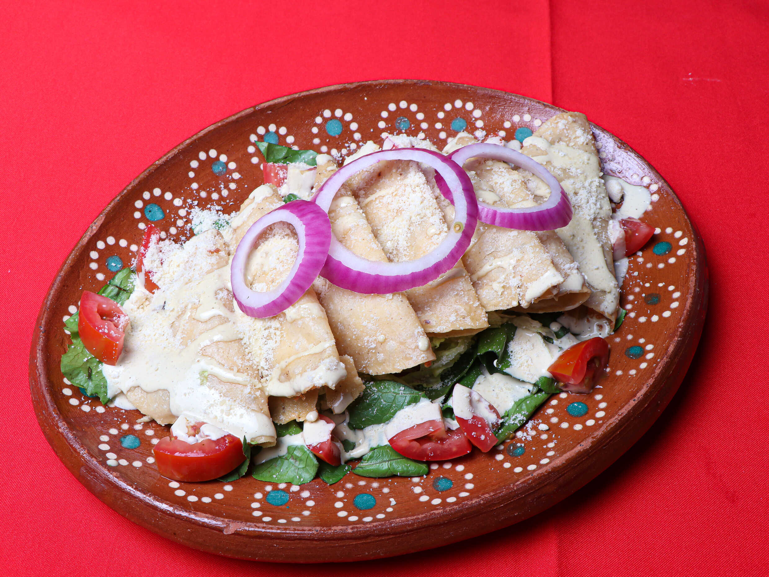 Acompañados de frijoles refritos, lechuga, crema y cebolla en escabeche.