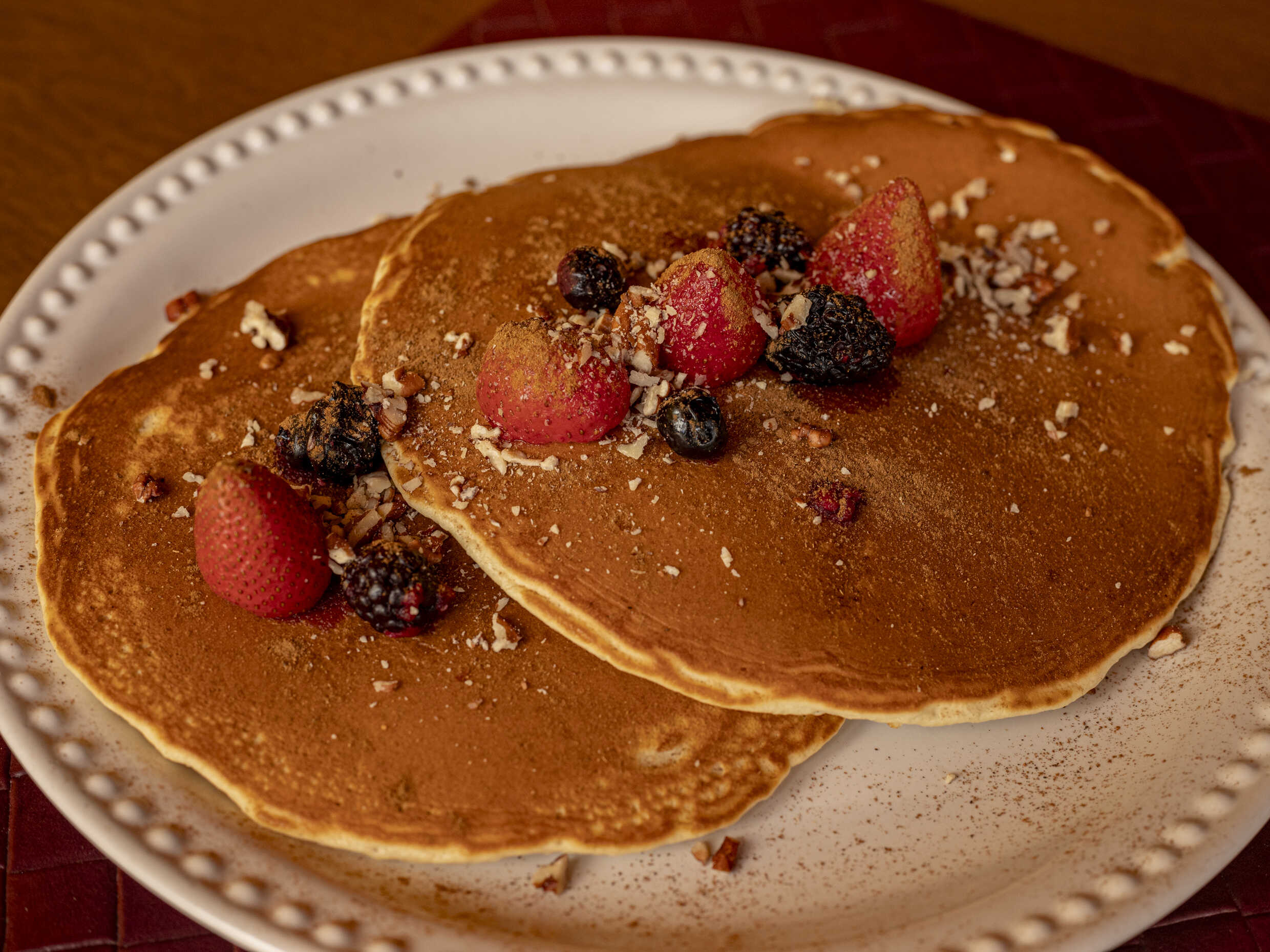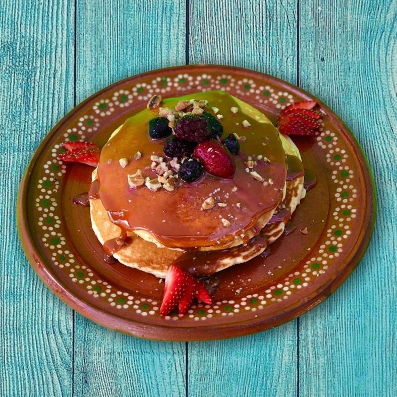 Dos hot cakes acompañados de frutos rojos y cajeta.