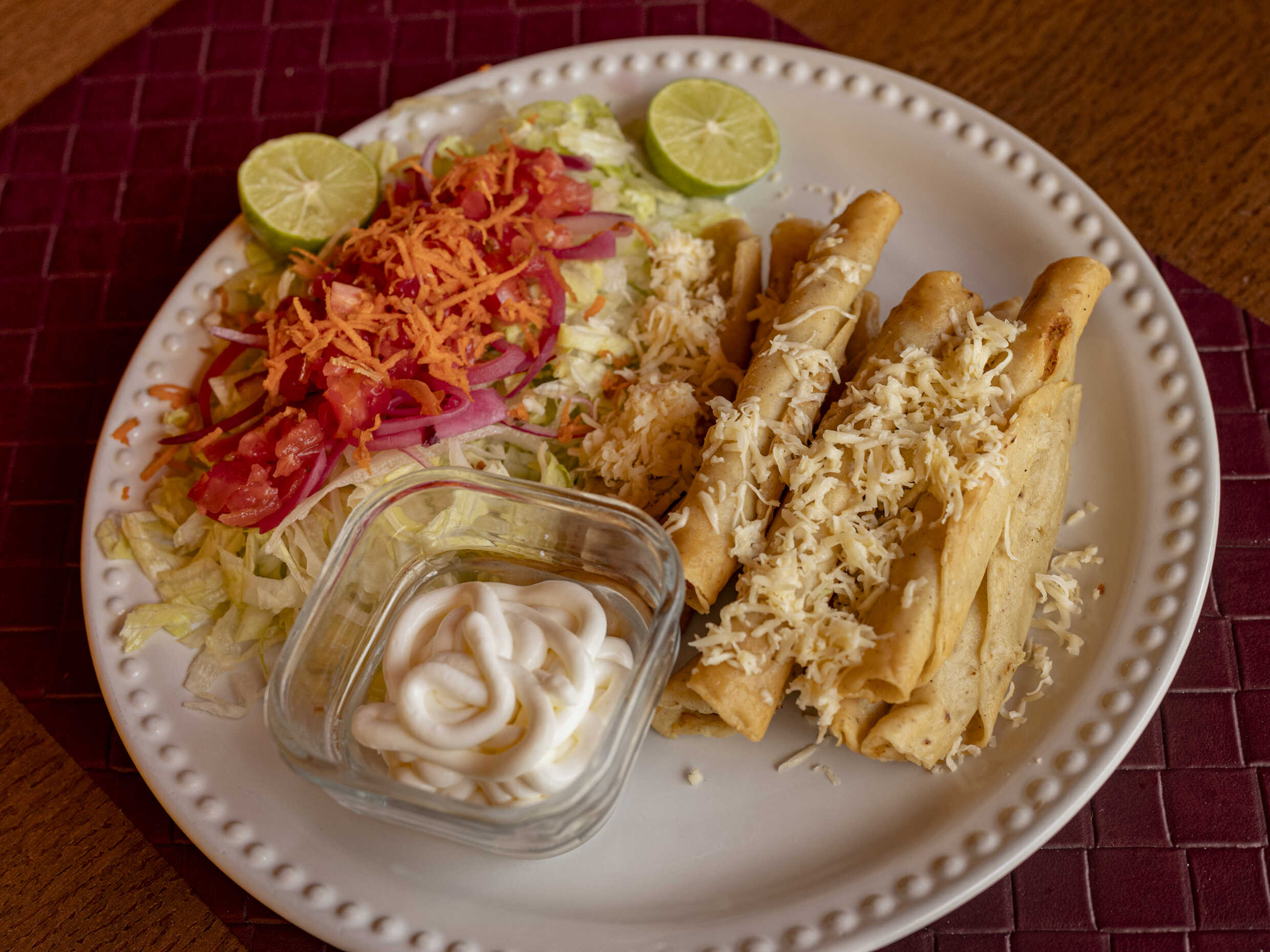 8 Tacos Dorados de carne deshebrada con verdura y limón.