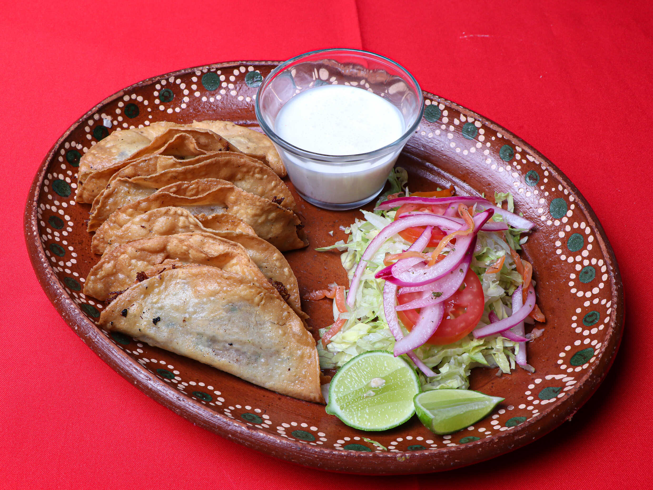 Siete tacos dorados de carne deshebrada con la receta de la casa.