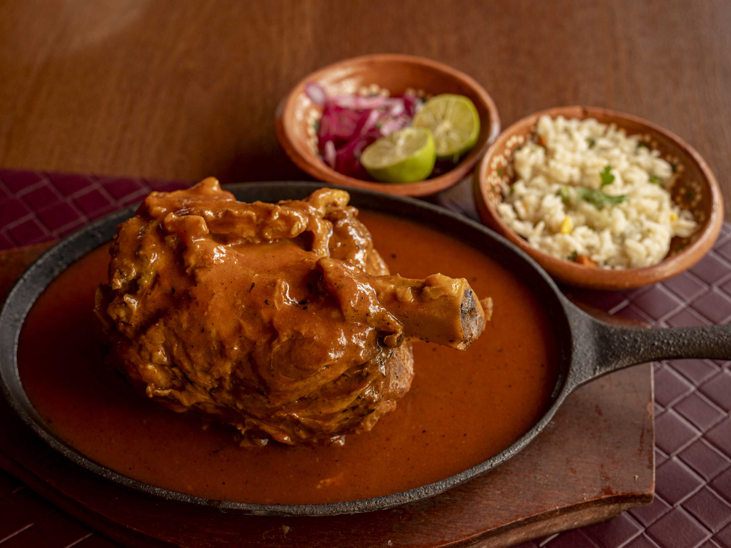 Chamorro al pibil acompañado de arroz y cebolla en escabeche.