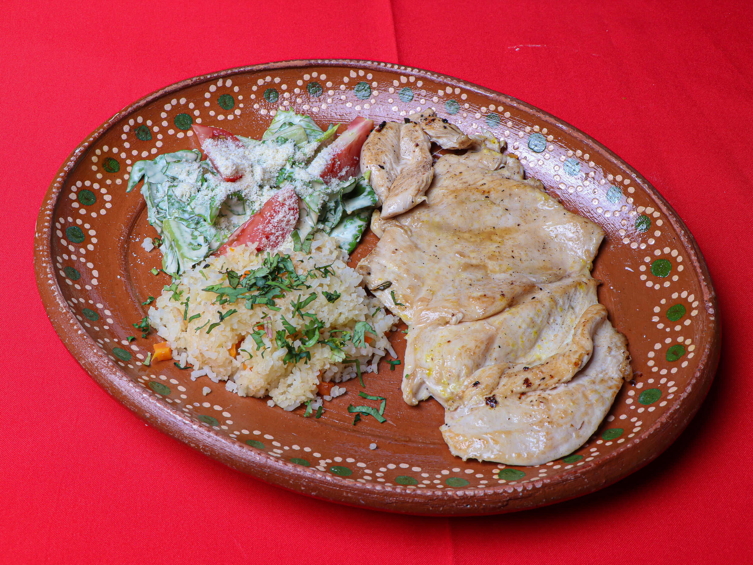 Pechuga de pollo a la plancha con ensalada y arroz.
