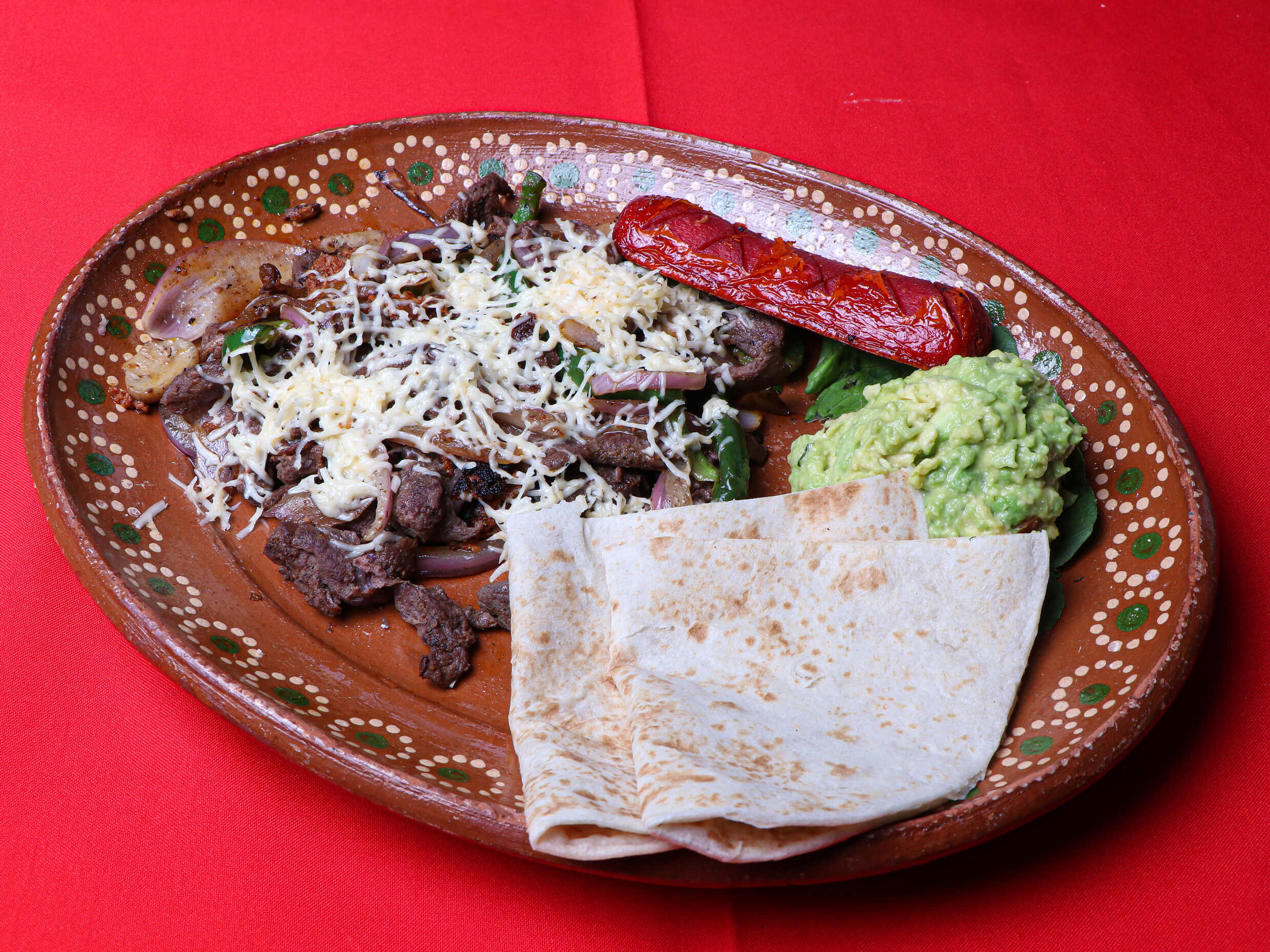 Fajitas de arrachera, acompañadas de frijoles refritos.