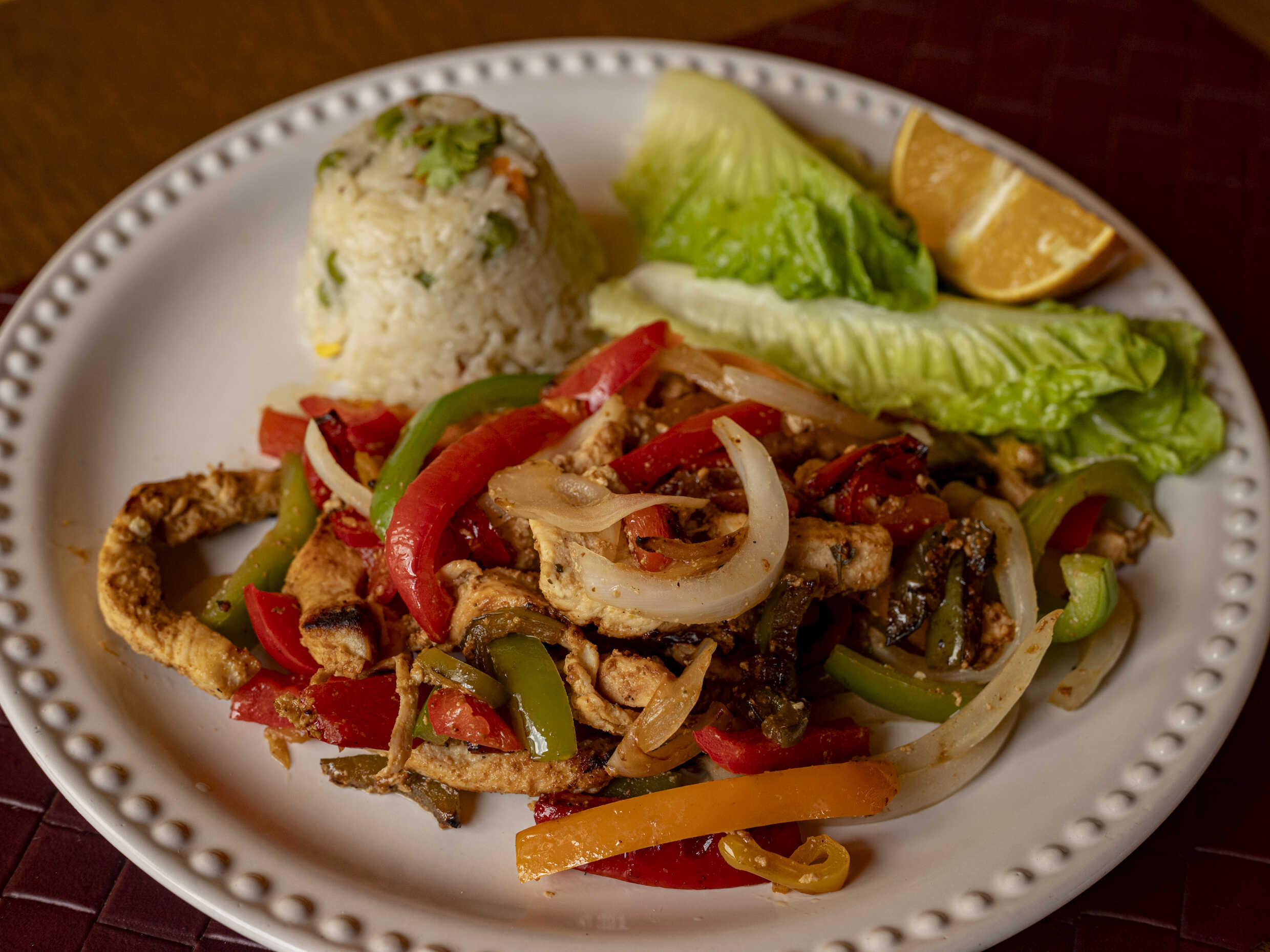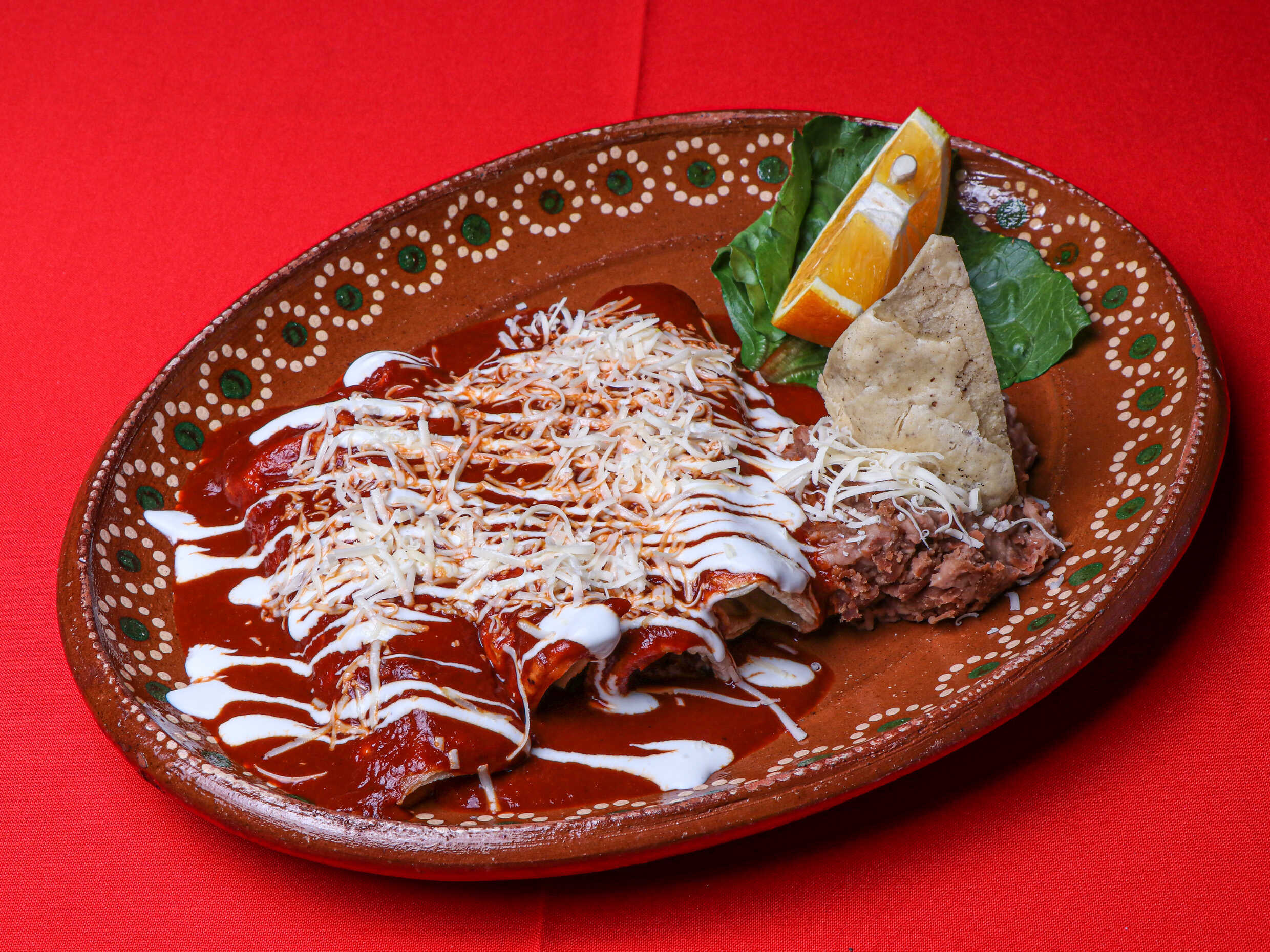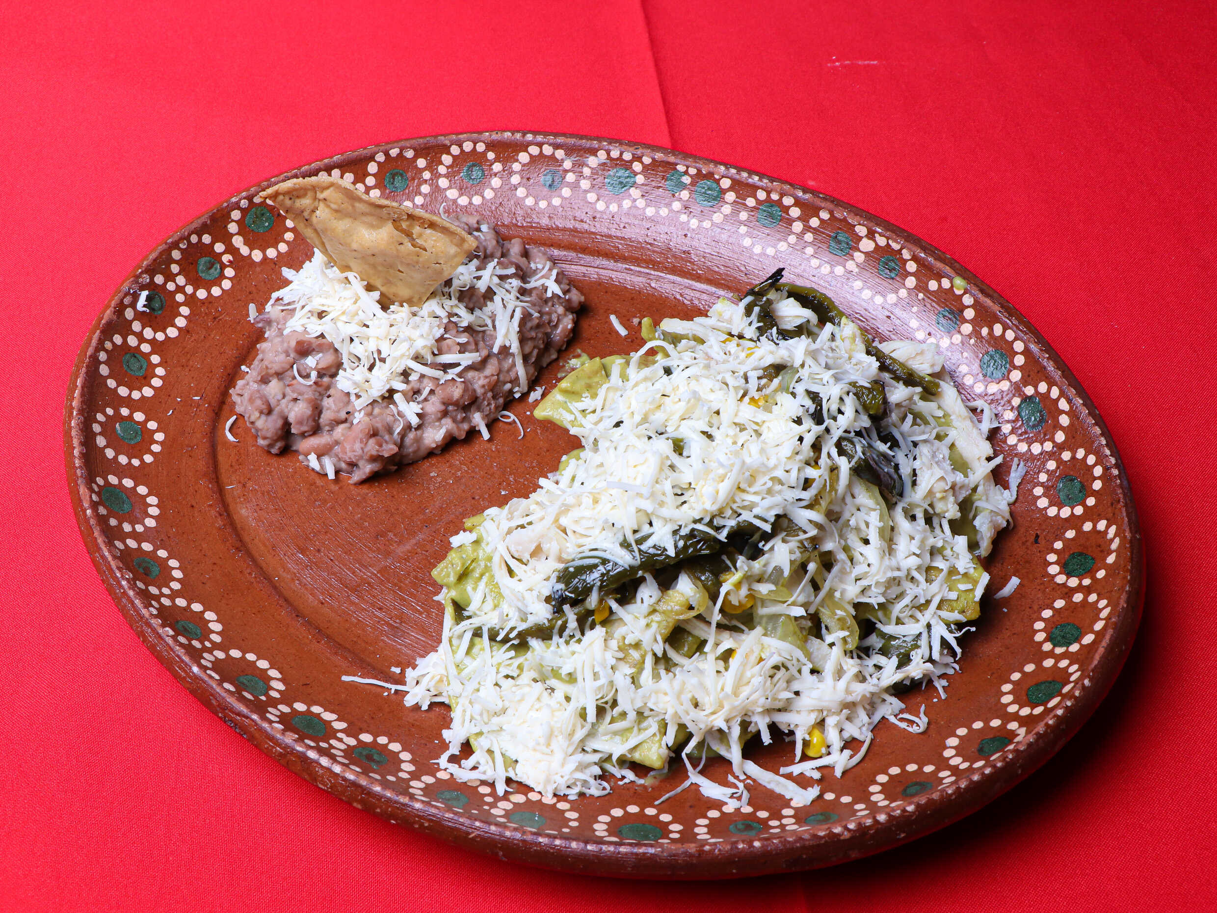 Acompañados de pollo, queso gratinado, rajas poblanas y frijoles.
