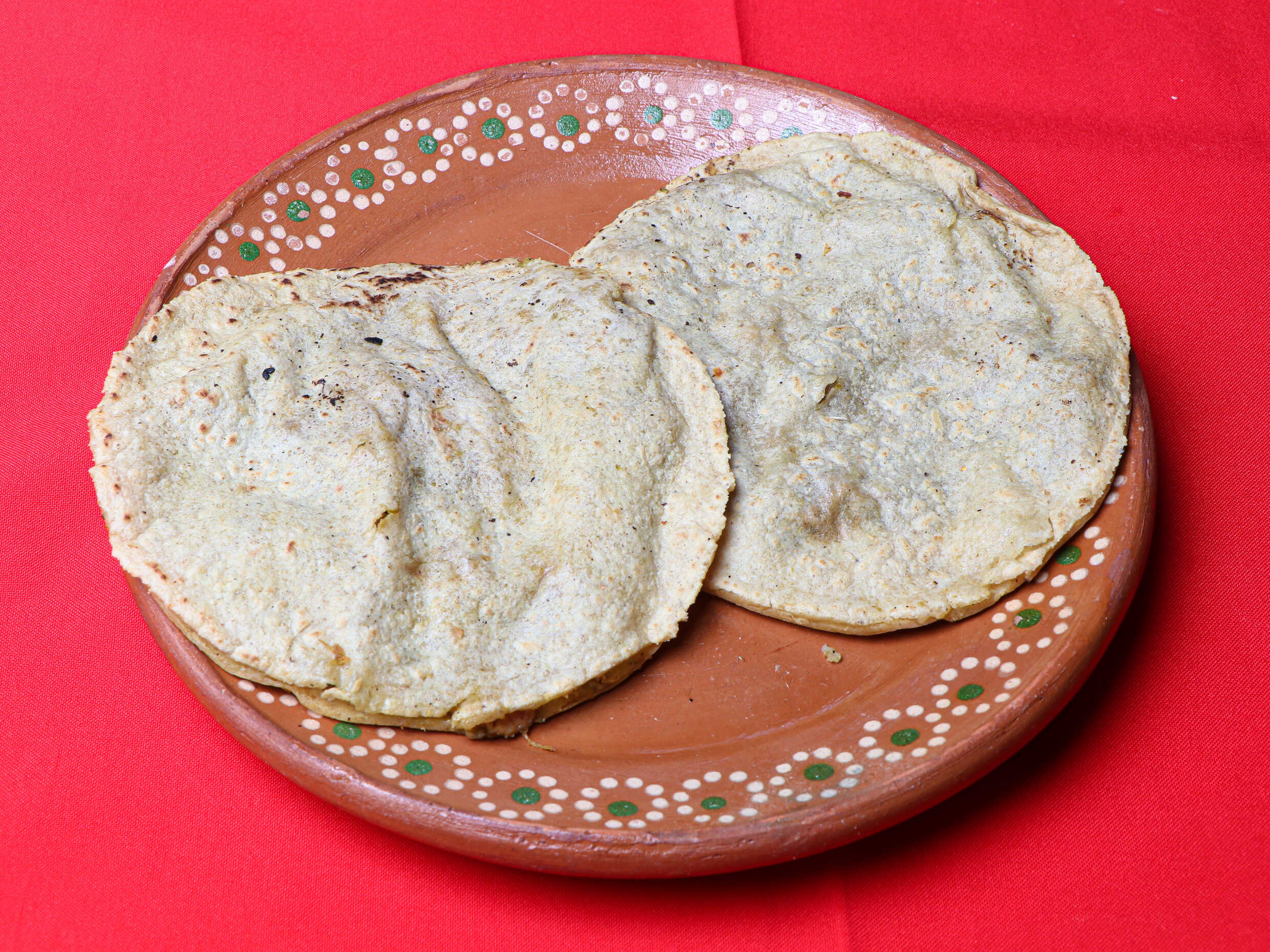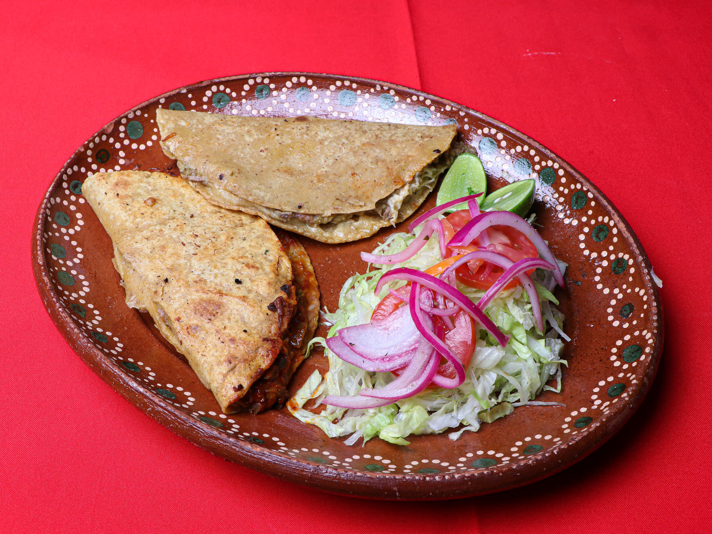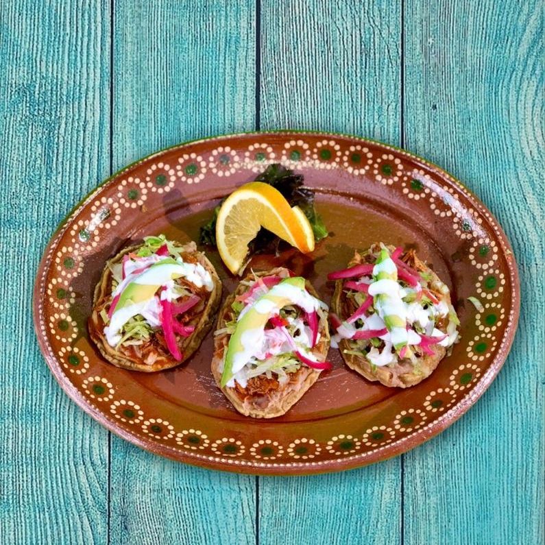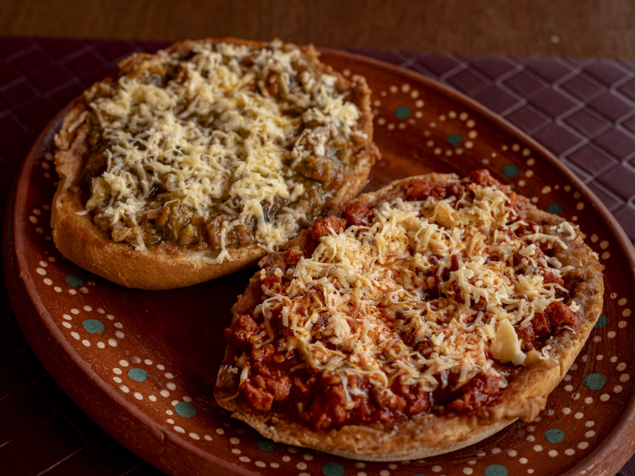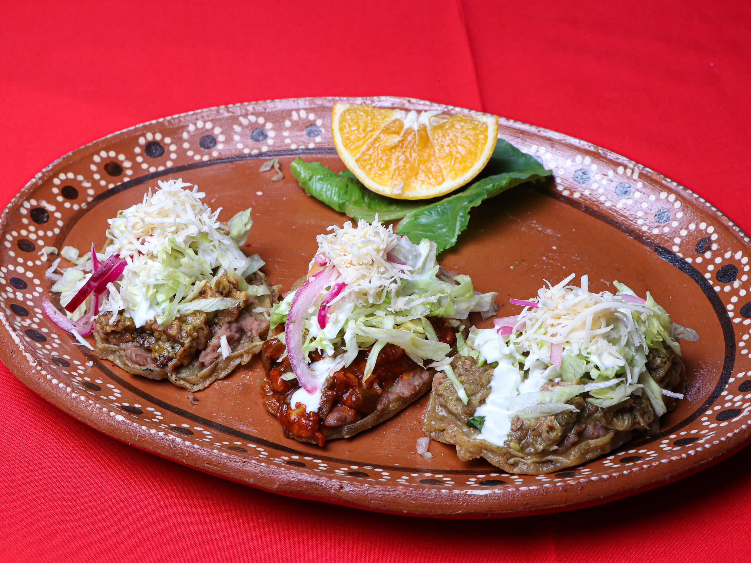 Gordita de maíz de deshebrada en salsa verde, asado rojo, chicharrón, discada y más.