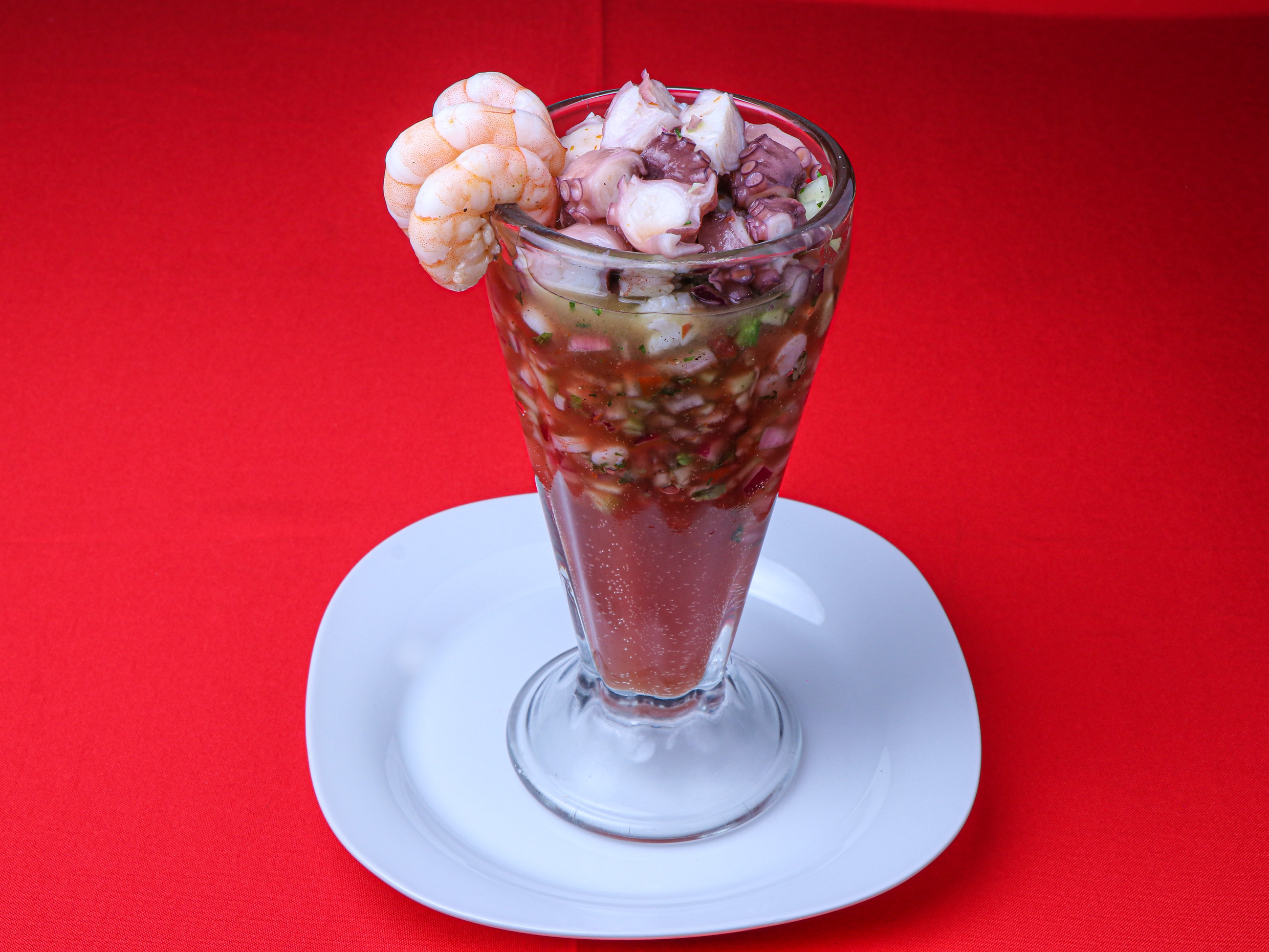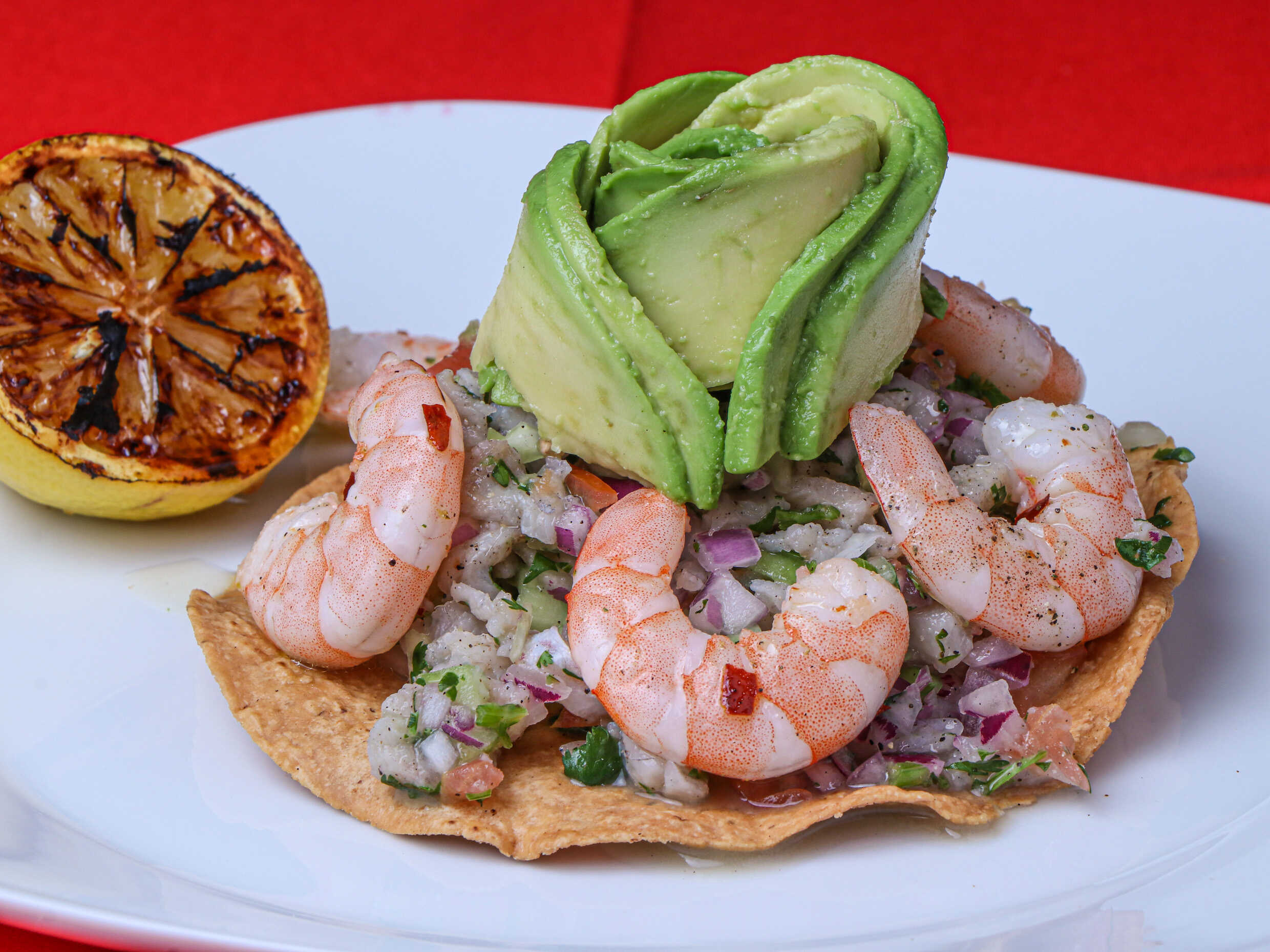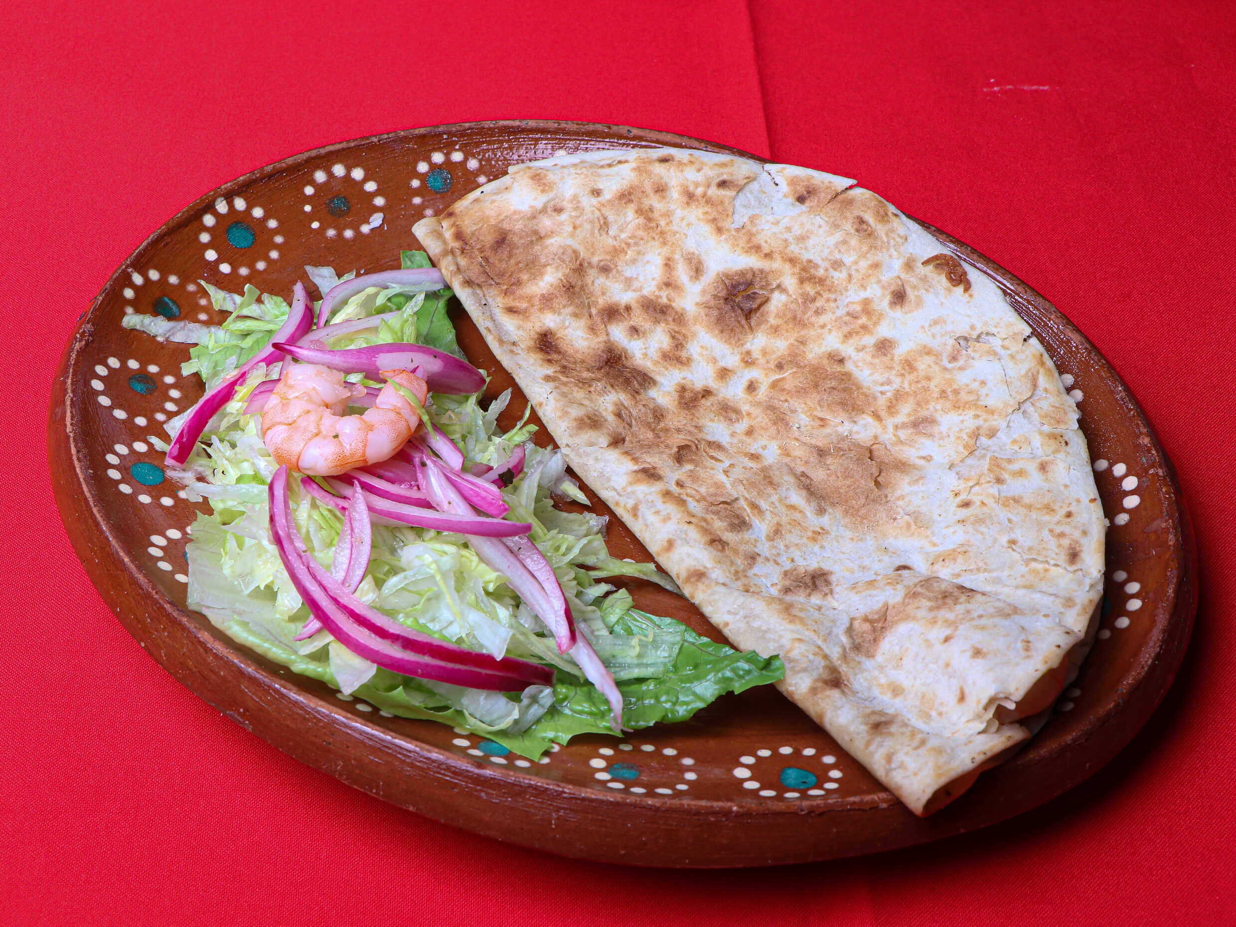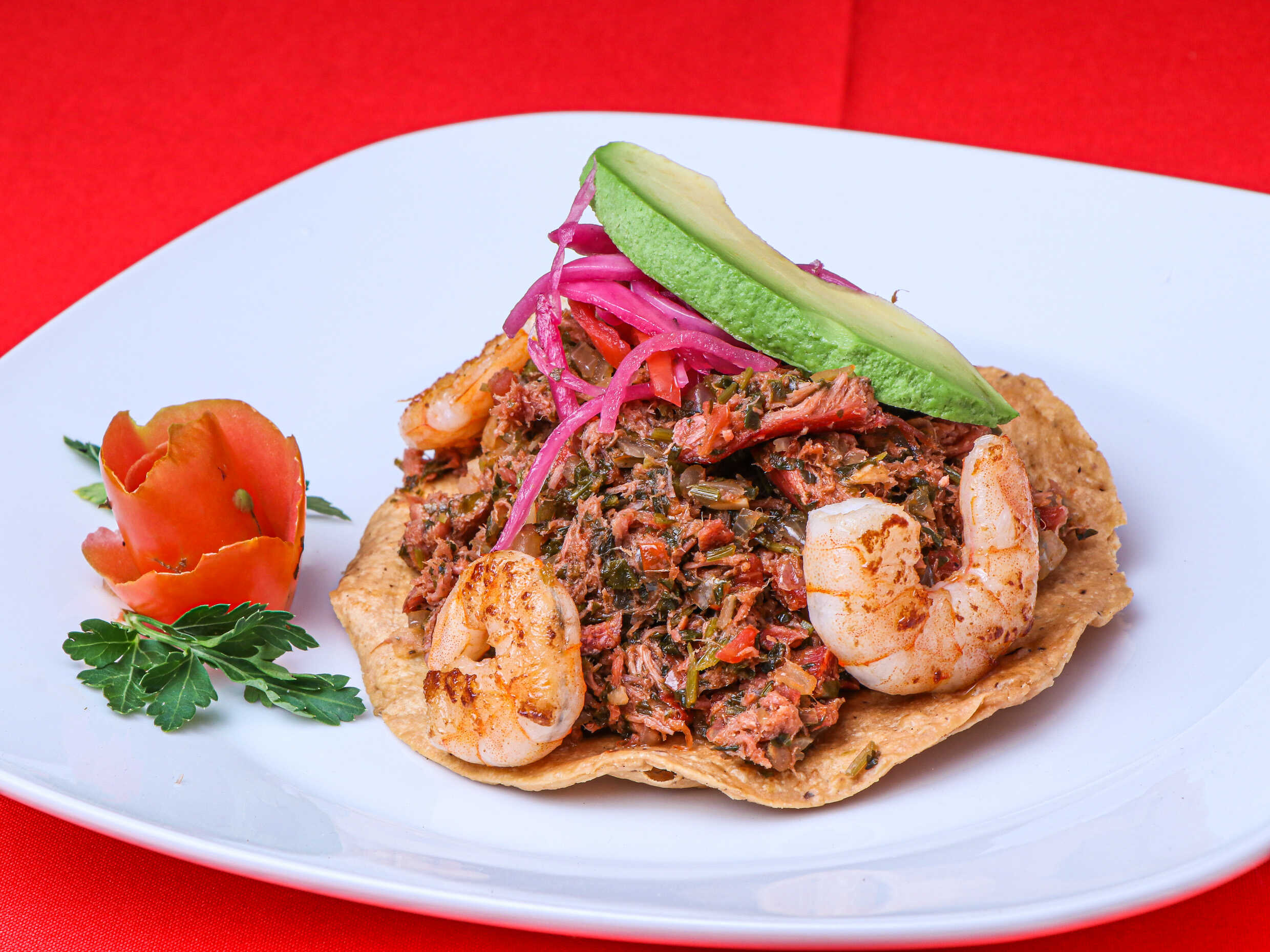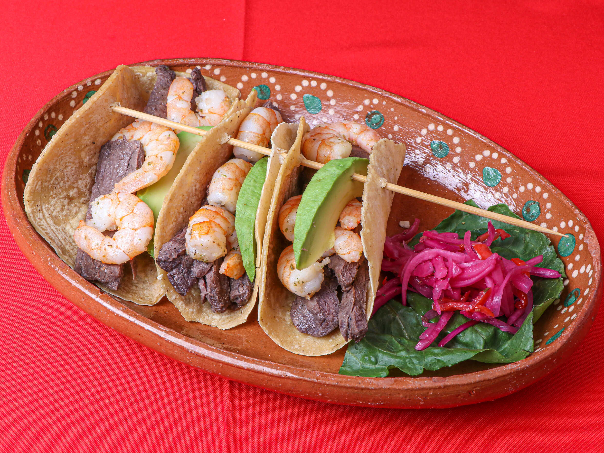 Cuatro tacos de deliciosa arrachera con camarones a la parrilla, acompañado de ensalada, cebolla en escabeche, limón y salsa.