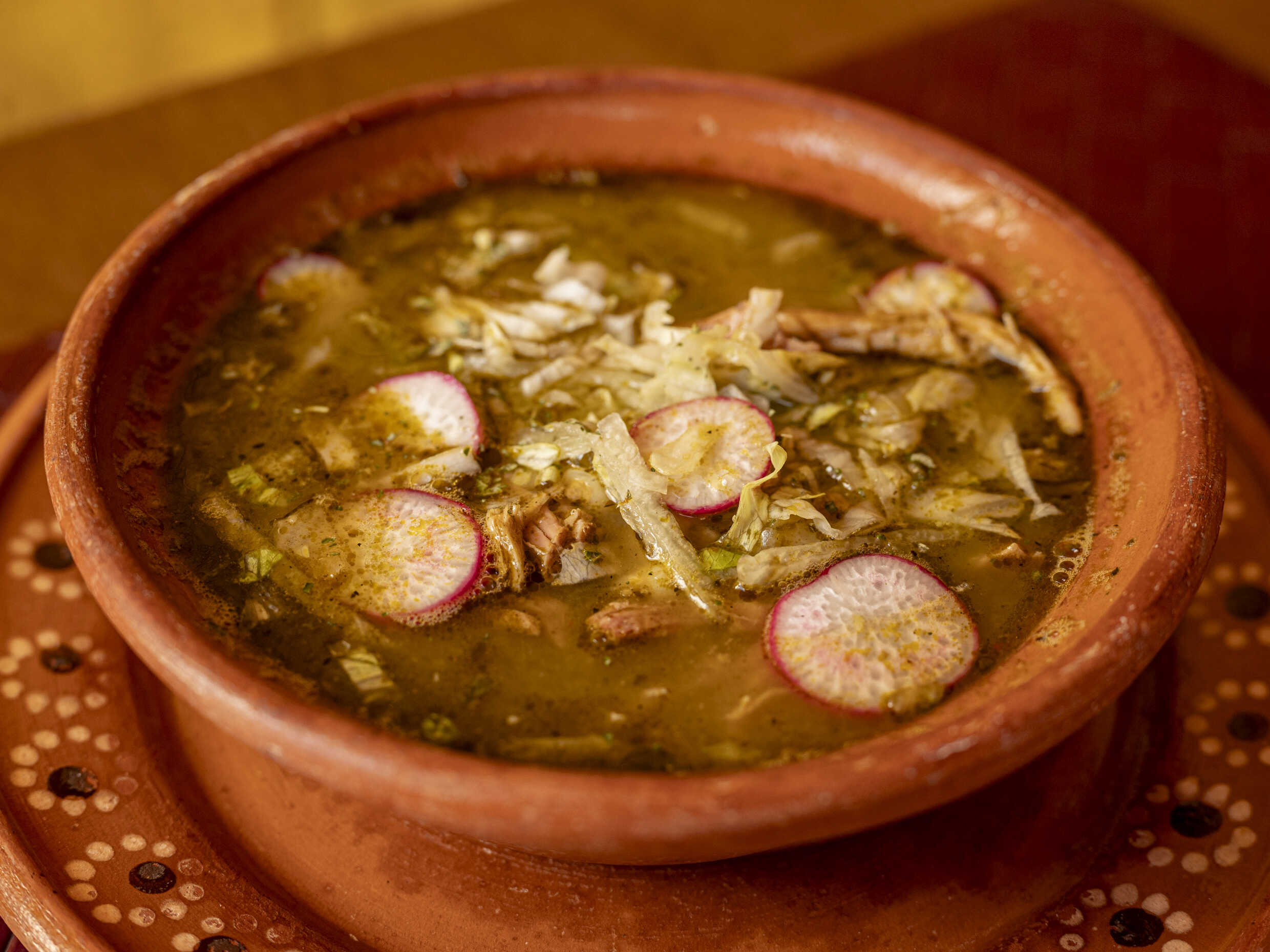 Pozole Verde de 1 litro , cebolla, limones, rábanos y lechuga, 130 gramos de carne y 130 gramos de pozole.