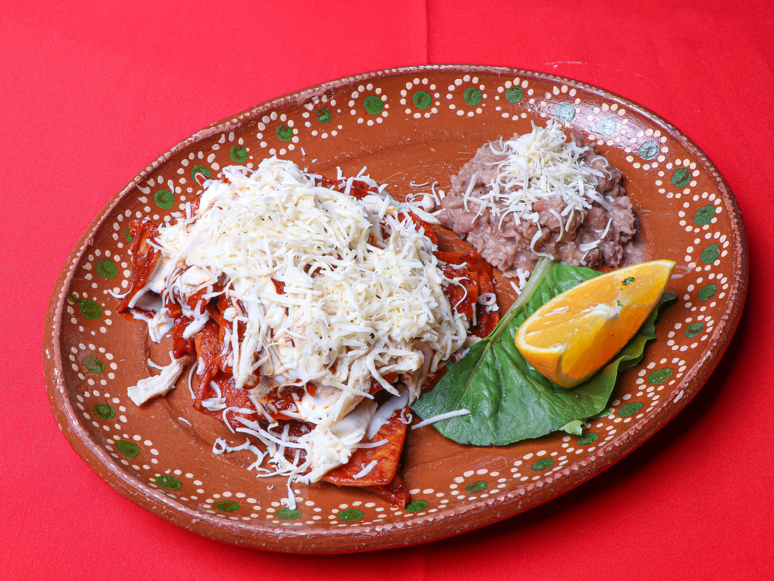 Chilaquiles rojos dulces o salados, con pollo, crema, queso y frijoles refritos