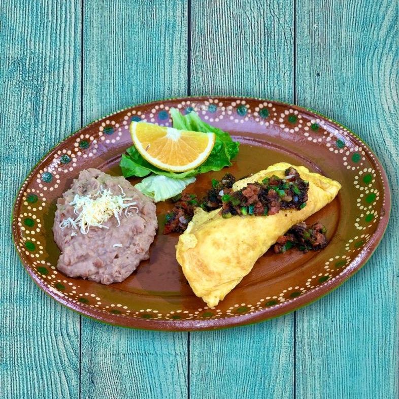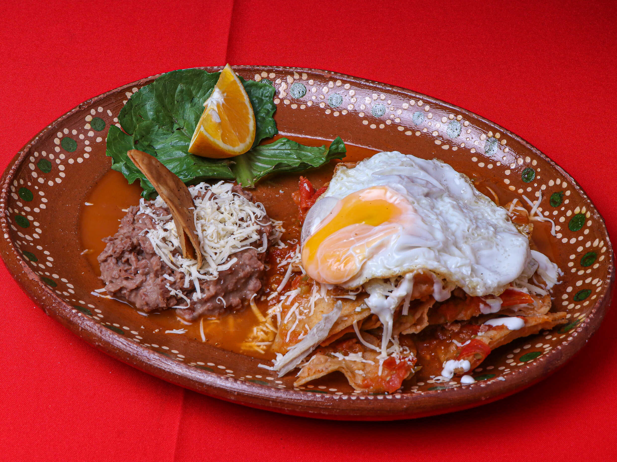 Acompañado de machaca frita a la mexicana y queso panela con chilaquiles verdes o rojos y frijoles refritos.