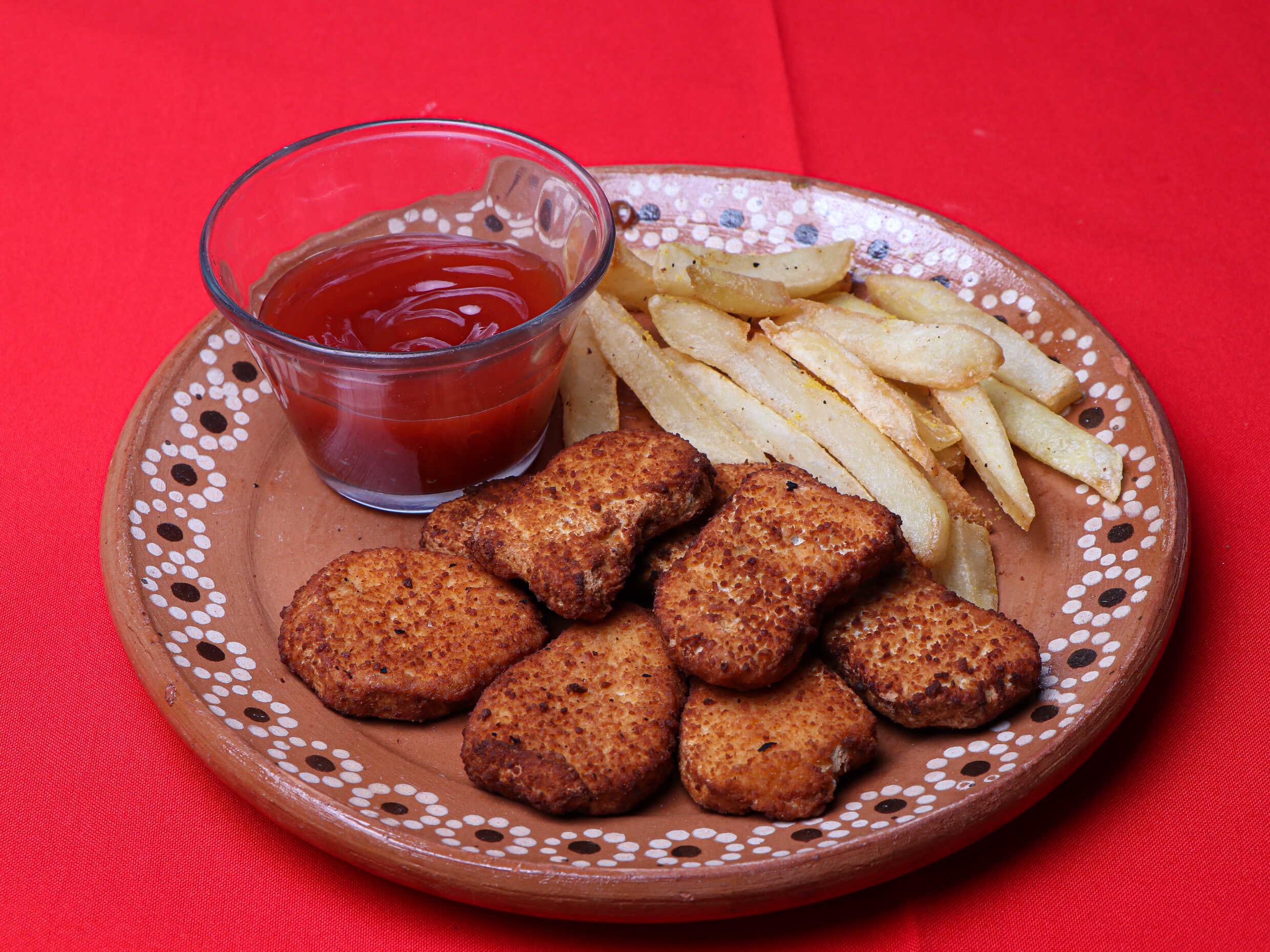 Nuggets de pollo (acompañados de papas a la francesa y ensalada verde).