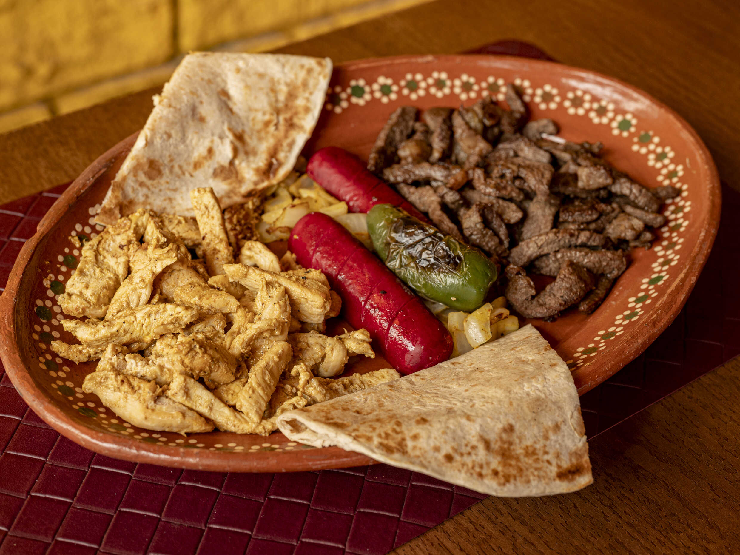 Parrillada para dos personas (con arrachera, pollo, salchicha asada, chiles toreados, frijoles charros, cebollita asada, tortillas y salsa).