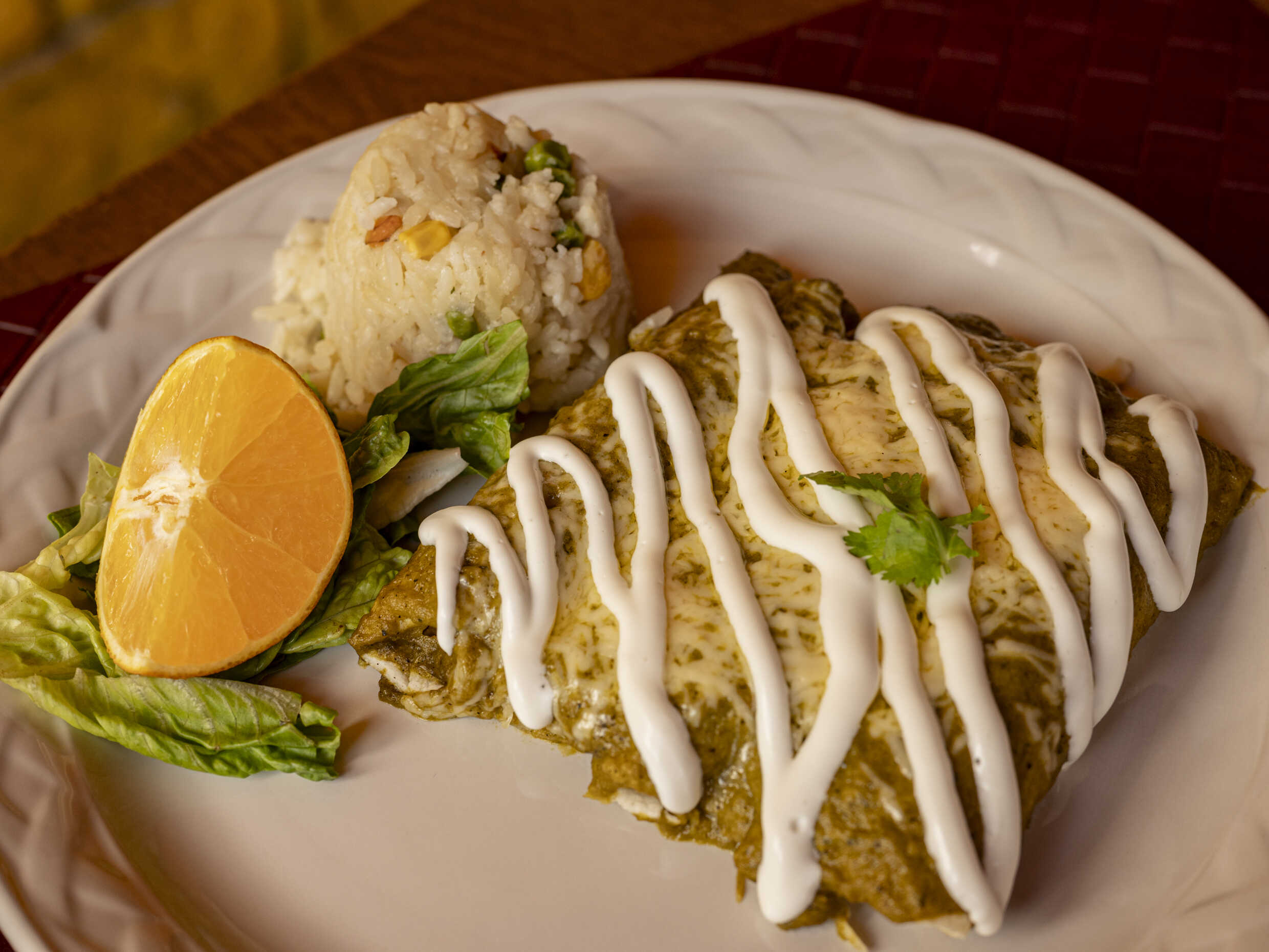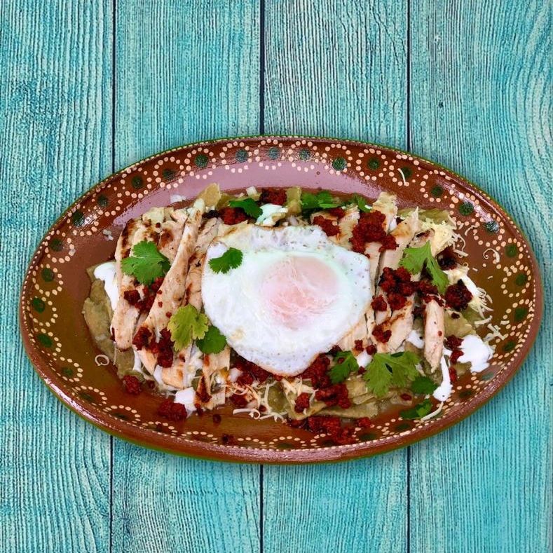 En salsa verde, acompañados de una escalopa de pollo, una pieza de huevo frito, chorizo, crema y cilantro.