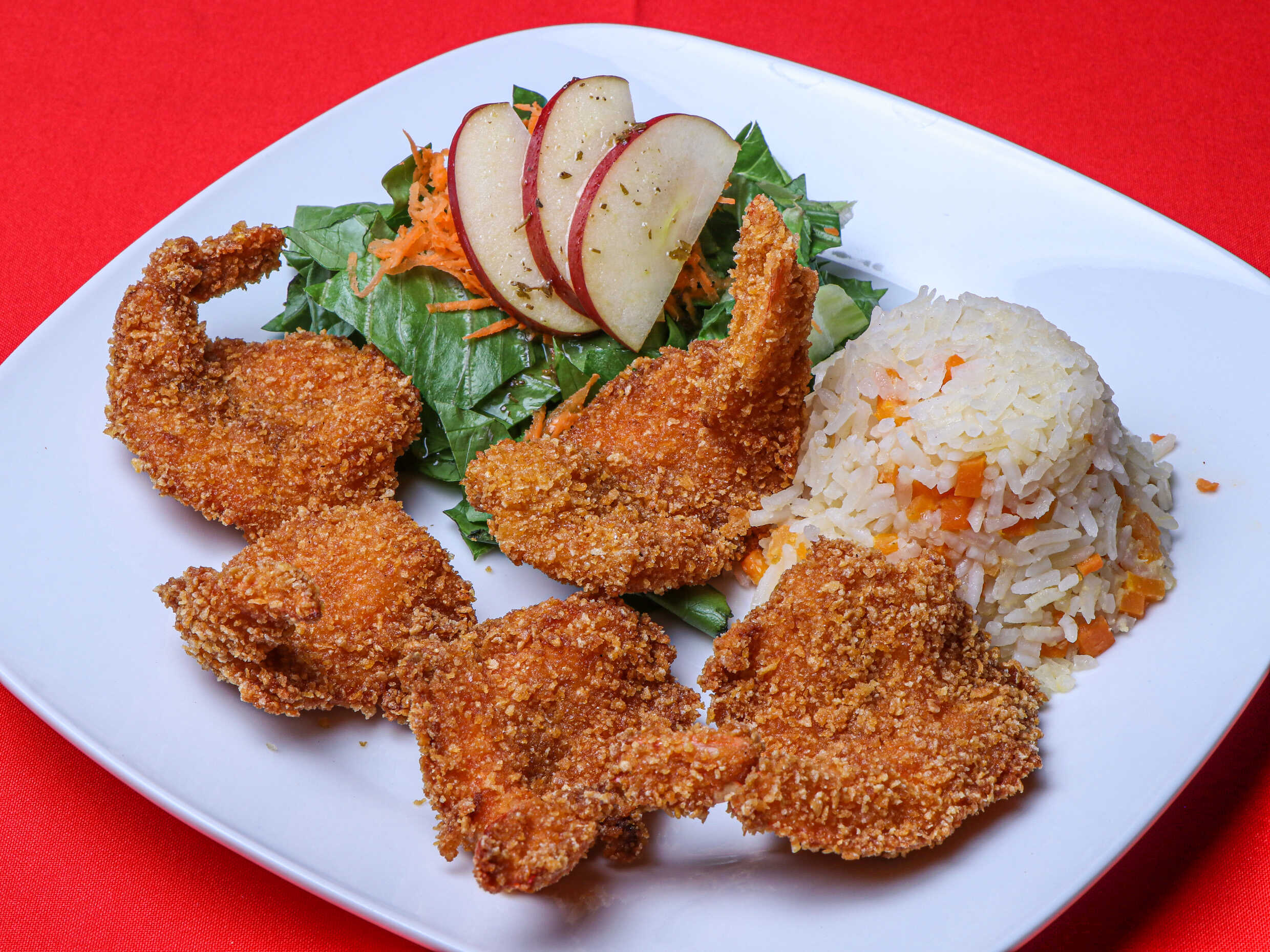 Camarones empanizados, a la diabla o al mojo de ajo, (acompañado de arroz y ensalada).