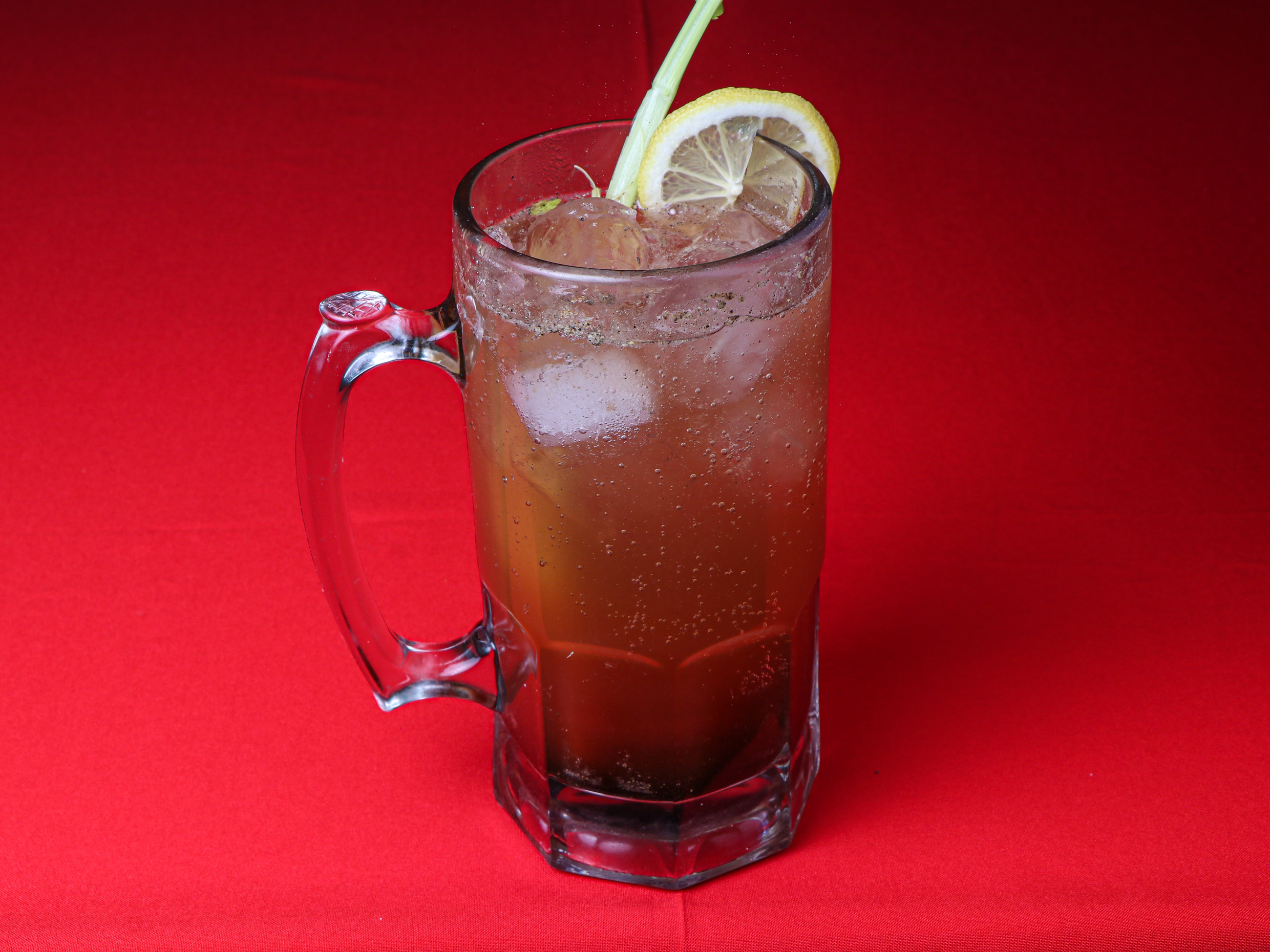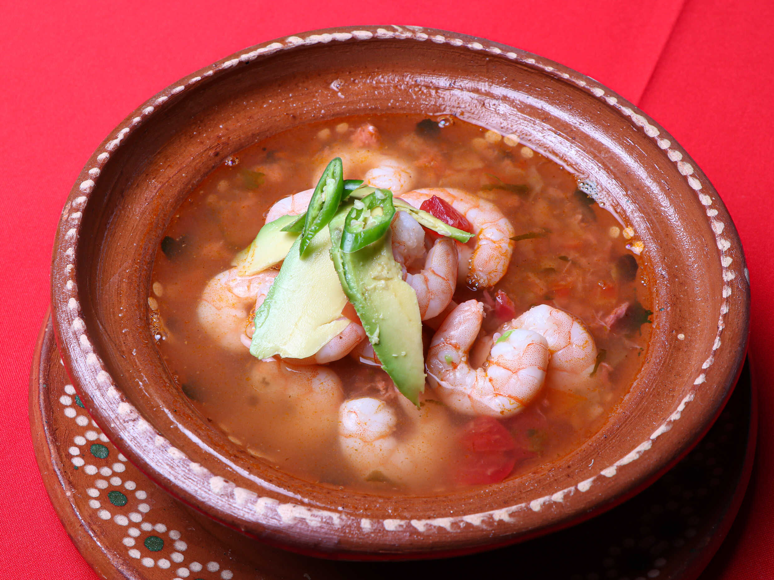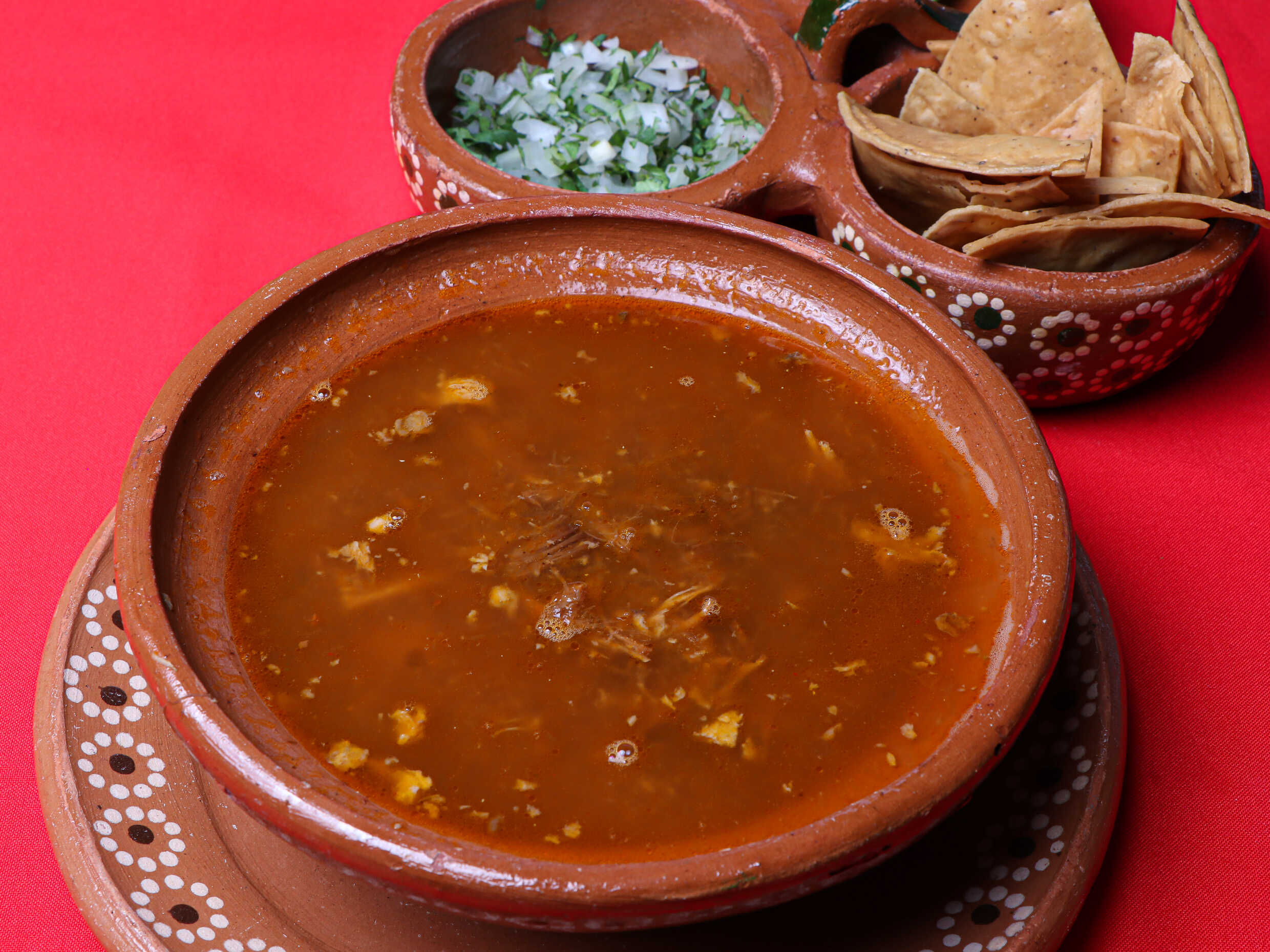 Delicioso caldo con porción de carne de res, elote, verduras, arroz, limón, tortillas y salsa