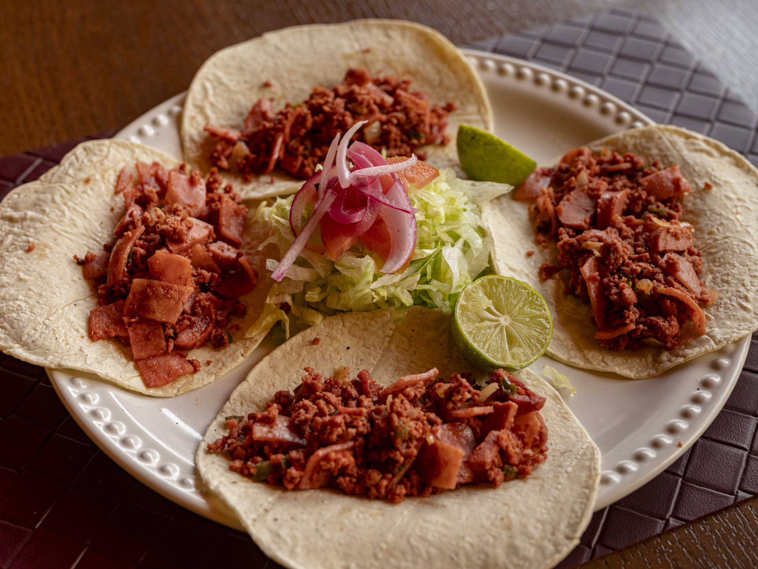 Tacos en tortilla de maíz recién hechas con frijoles y un delicioso guiso.