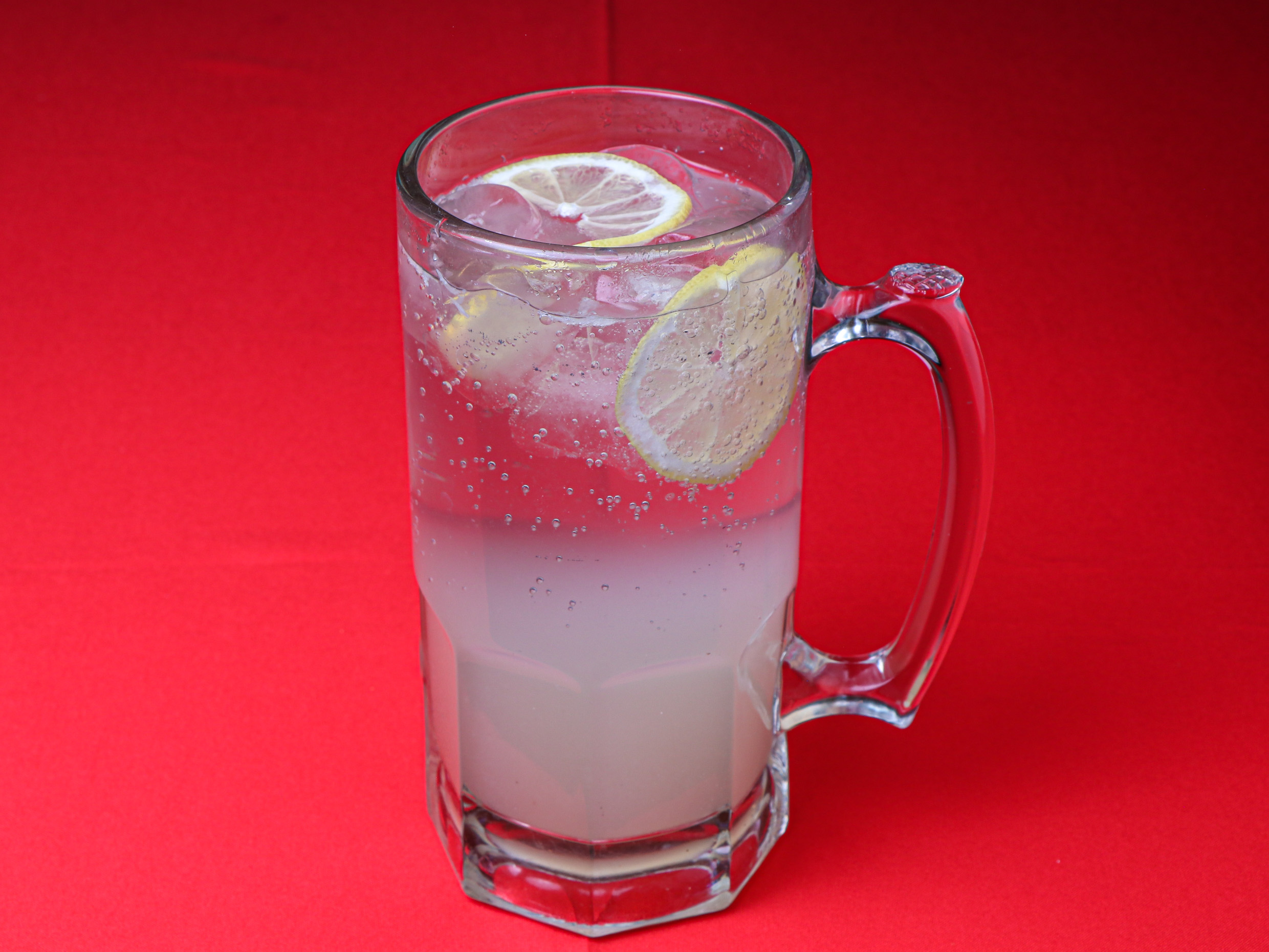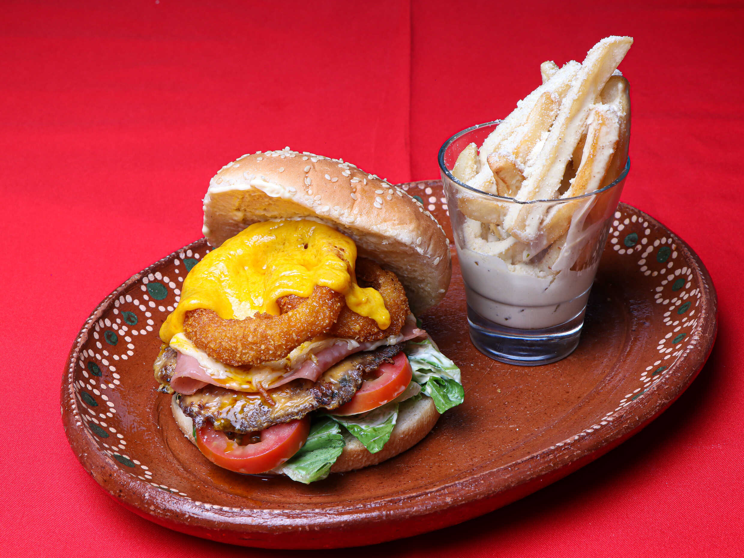 Pan, carne de res, queso amarillo, queso gratinado, lechuga, tomate, chile, cátsup, mostaza y mayonesa, acompañada de papas a la francesa.