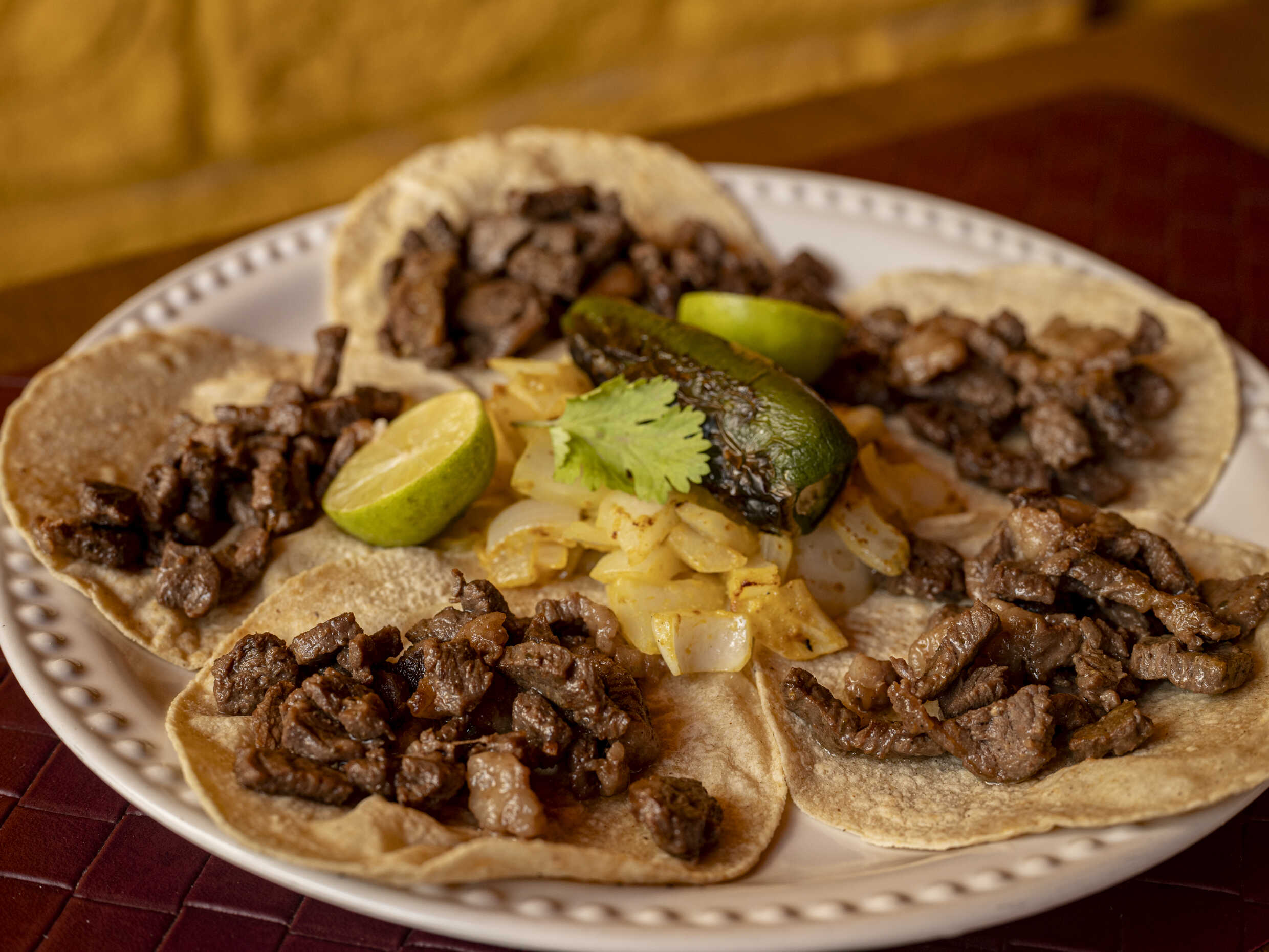 Con sus tortillas recién hechas, salsa, cebolla y limones.