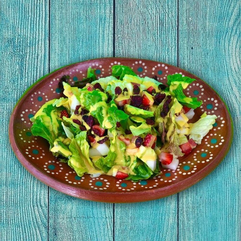 Mezcla de lechugas, arandanos, nuez, fresa, manzana y pera con un aderezo mostaza miel.