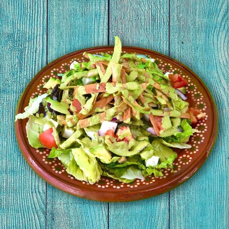 Una mezcla de lechugas, tomate, cebolla, aguacate, tortilla frita, chile triturado y un aderezo de cilantro cremoso.