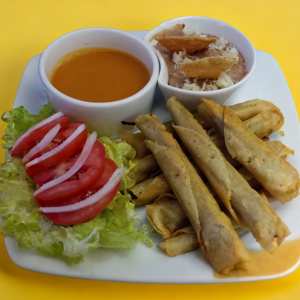 Orden de 5 Taquitos Dorados acompañados de ensalada Crema y Salsa!!!