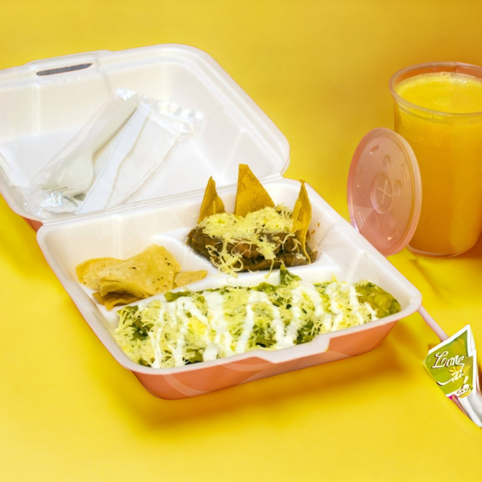 Desayuno chilaquiles Huevo frijolitos y agua de Frutas