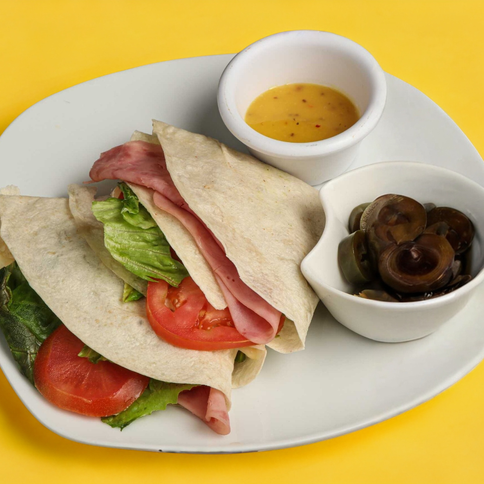 wrap de Jamon y queso con ensalada acompañada de salsita picosa